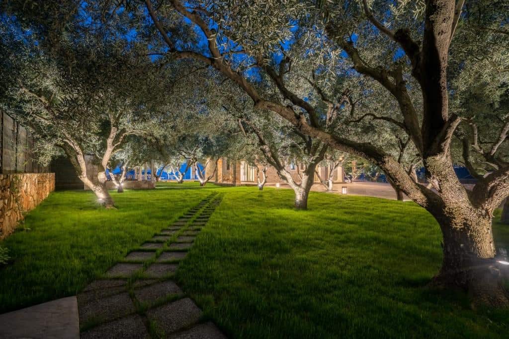 For those who enjoy al fresco dining, the covered outdoor dining area and BBQ provide the perfect setting for memorable meals under the Mediterranean sky. The beautifully landscaped outdoor spaces, adorned with lush green lawns and olive trees, invite guests to unwind and soak in the natural beauty surrounding them.