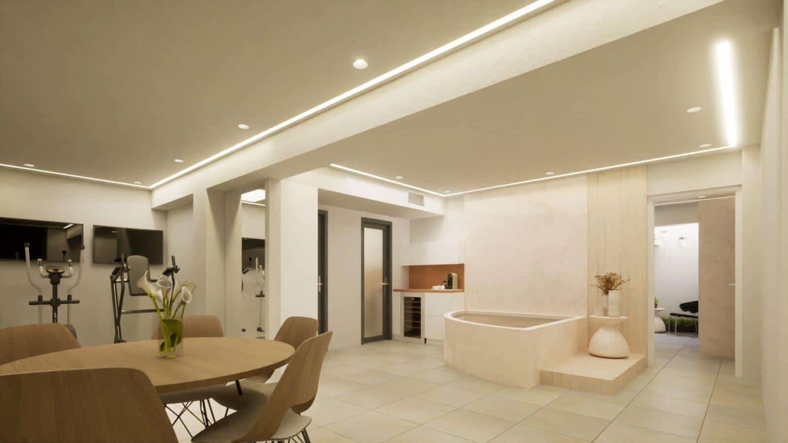 Boasting a spacious living area of 395m² spread across three meticulously designed levels, these villas offer a harmonious blend of comfort and elegance. The lower level, covering 100m², is a haven of relaxation, housing a fully-equipped gym with a rejuvenating sauna.