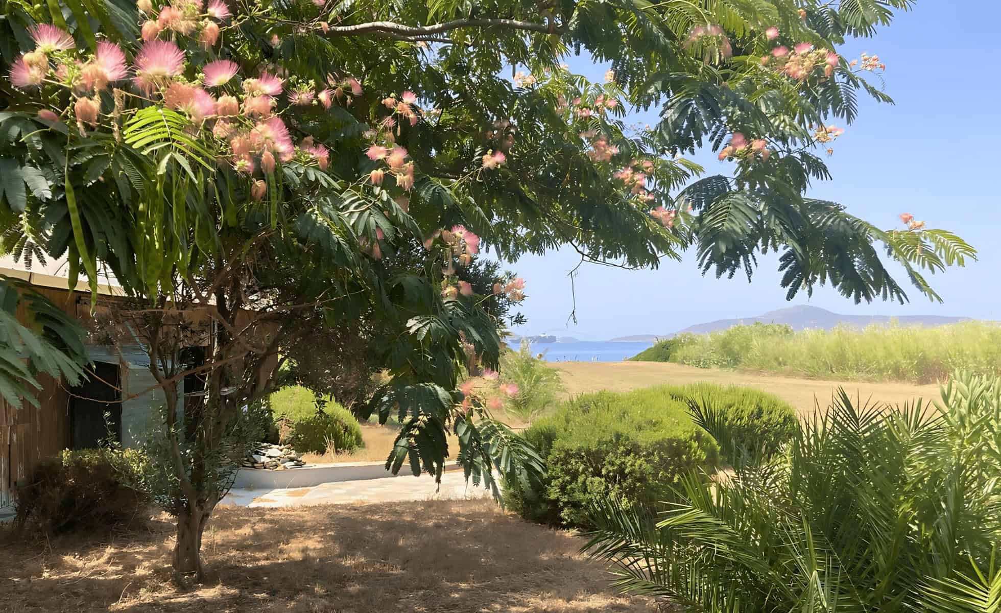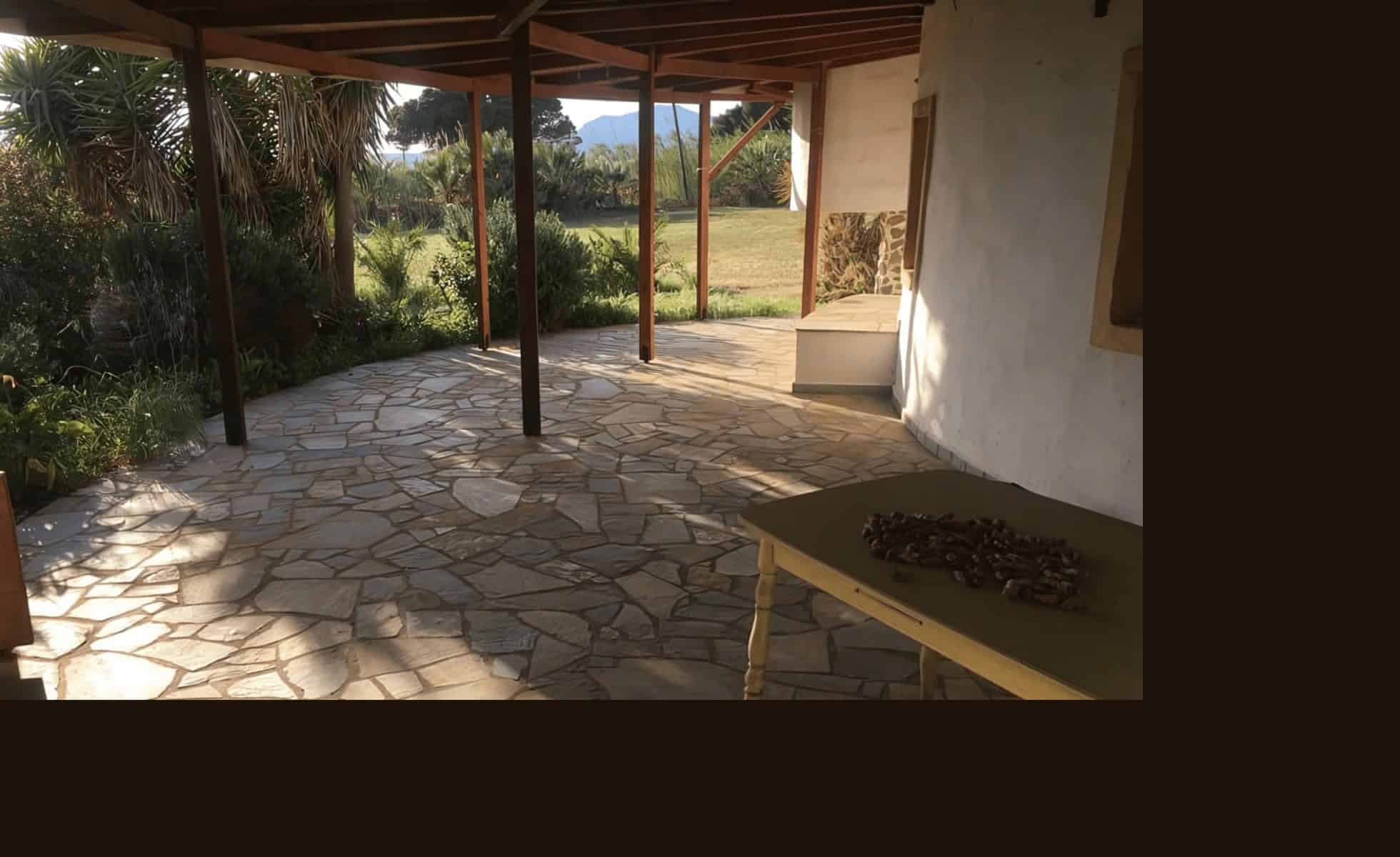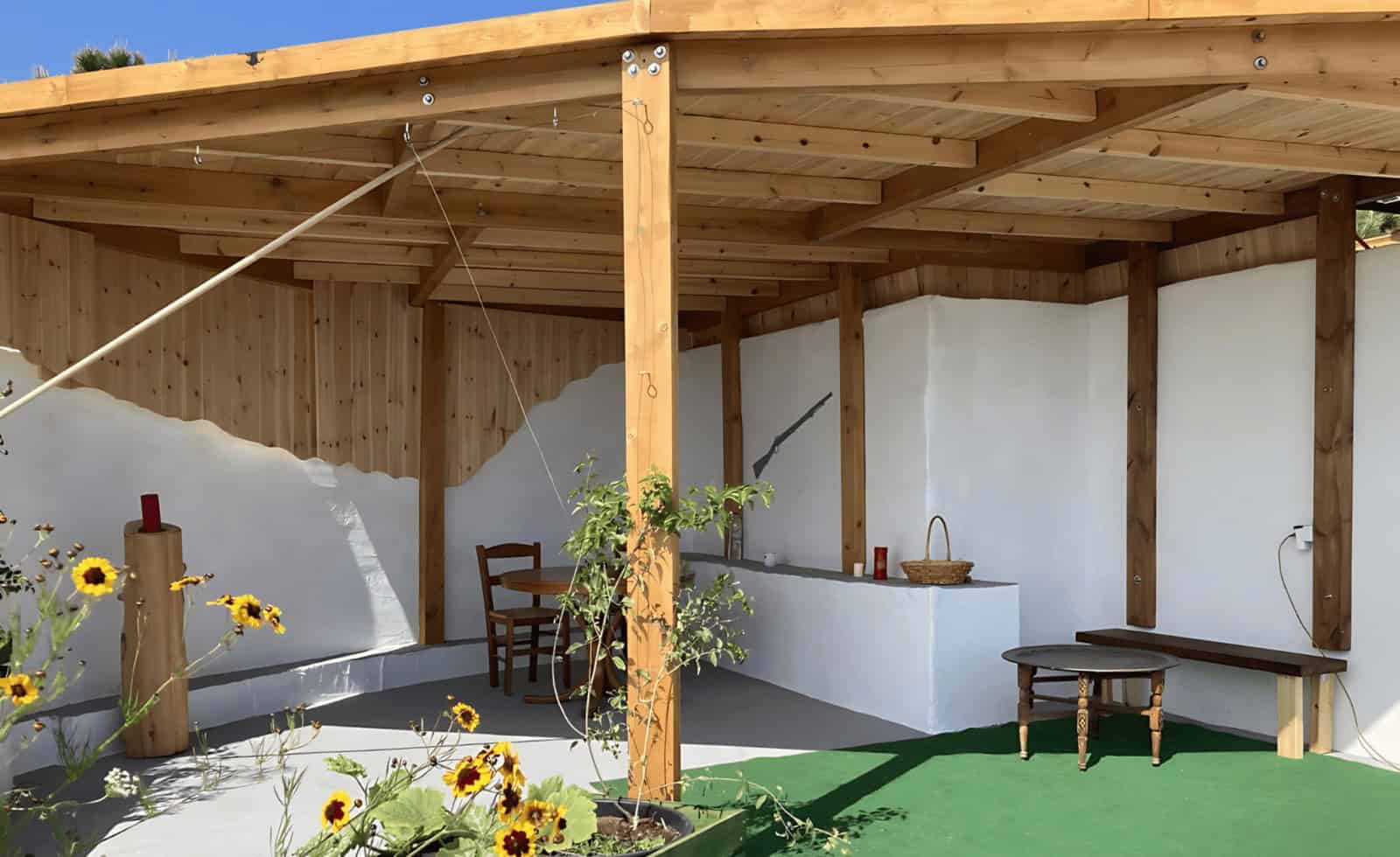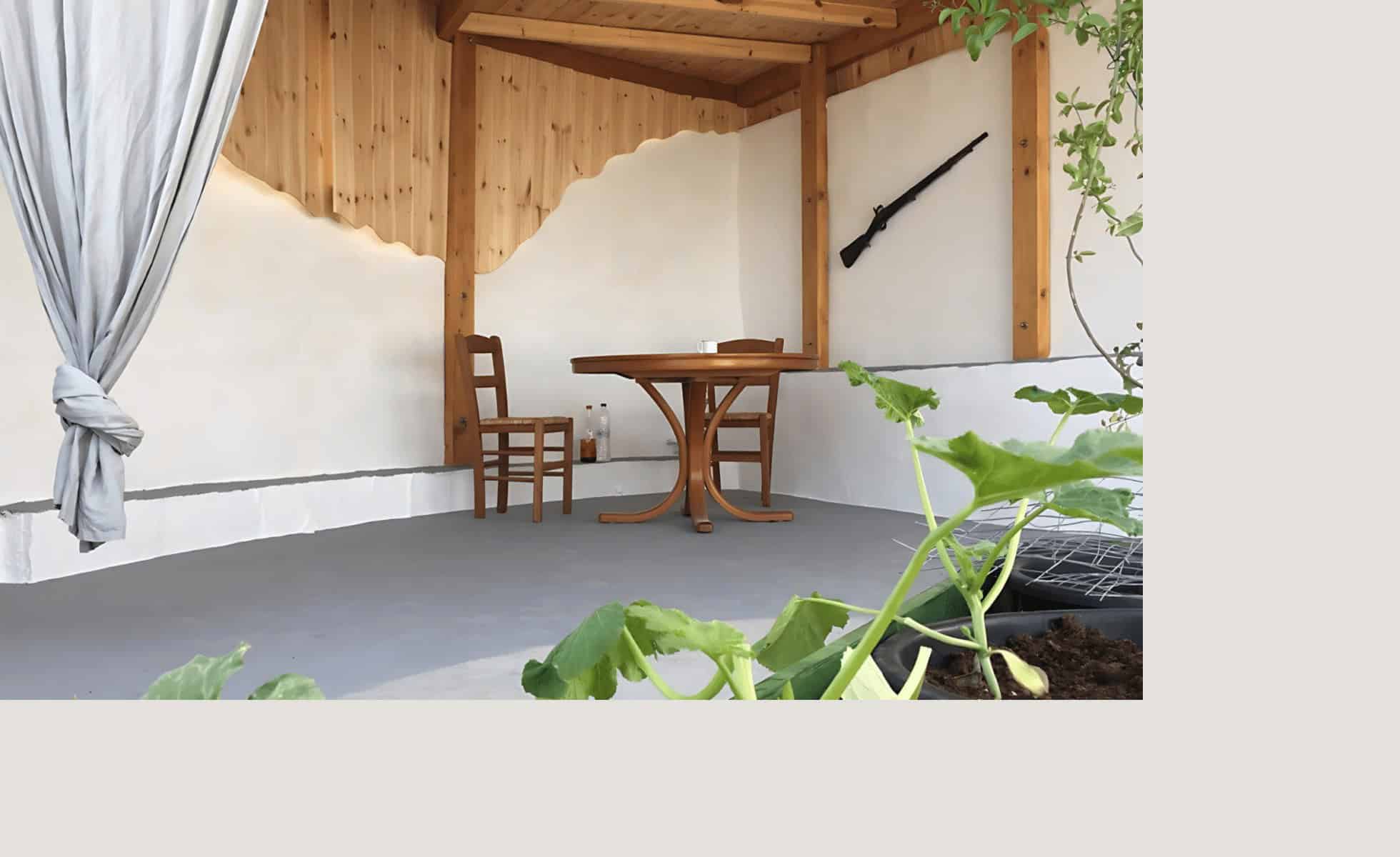 Outside, a 75m² Karystos stone terrace offers a BBQ, sink, stone bench, additional seating and a table in the eastern section, perfect for enjoying breakfast in the winter morning sun. A wooden staircase leads to the first floor, where a covered terrace provides a 270° panoramic view, stretching from Cap Maleas to the islands of Kithira and Elafonissos and the Mani Peninsula. A small infinity pool on the terrace can be heated to 33°C using solar energy or cooled with 20°C water from the well.
