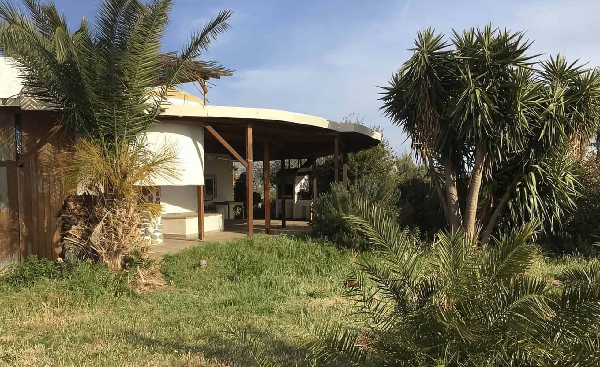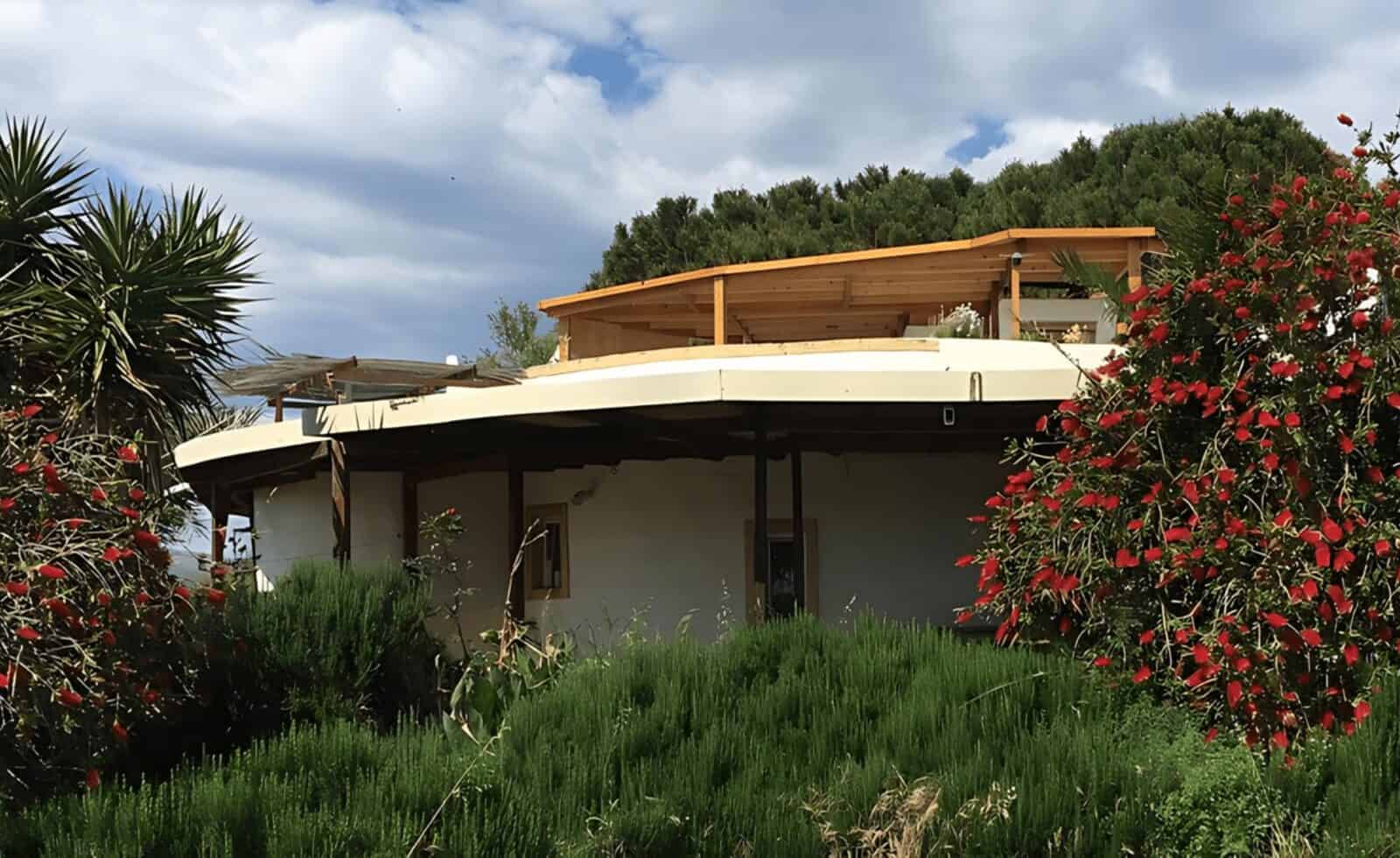 The main building features a round design with a floor area of approximately 100m², complemented by an 80m² extension that serves as a hangar, workshop, and garage. The circular shape was chosen for its enhanced stability and the fact that it reduces the external wall surface area by 14% compared to a square design of the same interior space. This design, combined with insulating glass and 30 cm thick Ytong block walls, results in lower energy costs for heating and cooling. A stove with an output of up to 8 kW provides cozy warmth, while an air conditioner with a consumption of just 1.5 kWh cools the rooms to a refreshing 25°C. The aerodynamic structure also ensures a tranquil interior, even during storms, with oriental carpets softening footsteps.