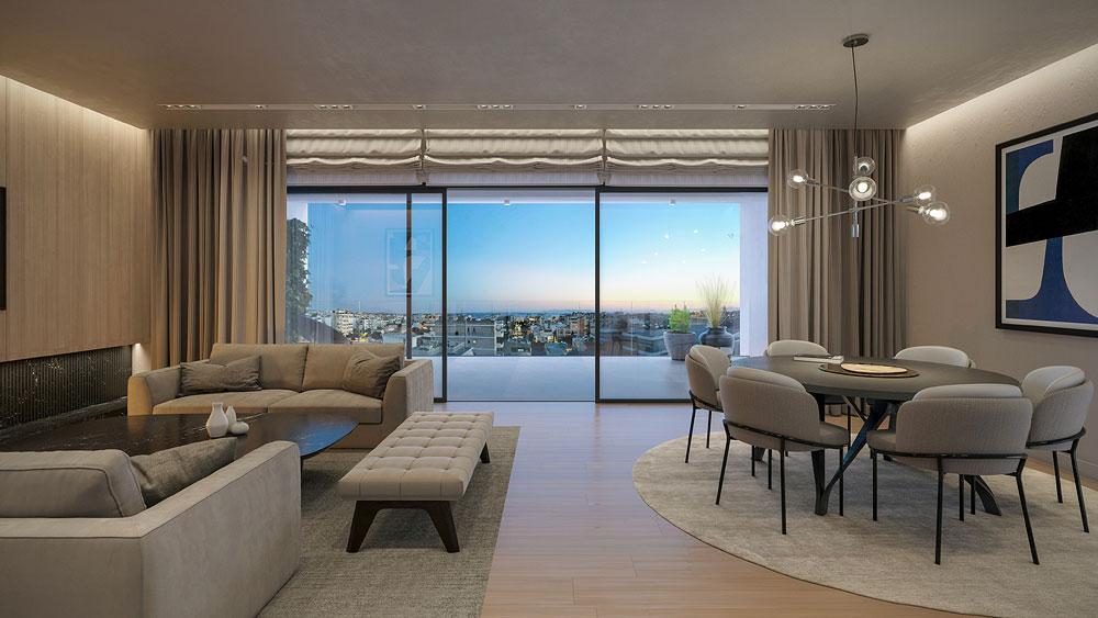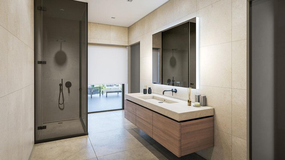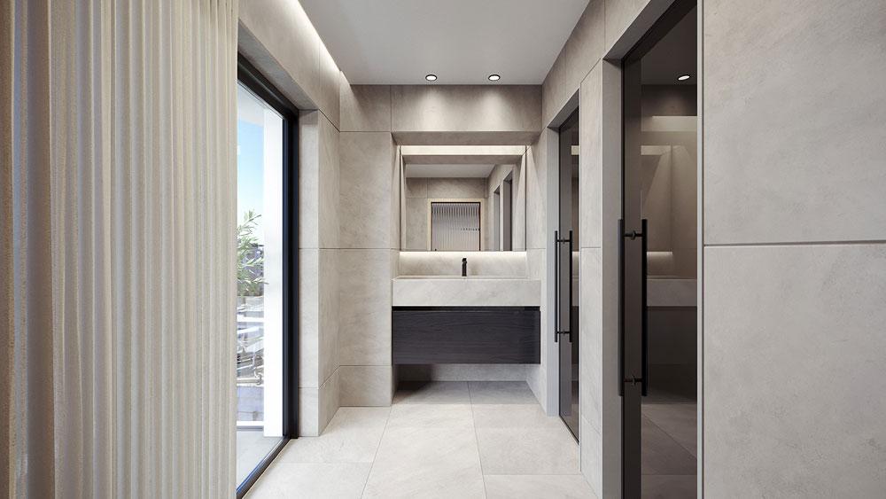 The interior design is characterized by Parkellas wood flooring and a selection of bathroom tiles, sanitary ware, batteries, and accessories from Lemonakis or Moda Bagno, offering a touch of elegance and customization.