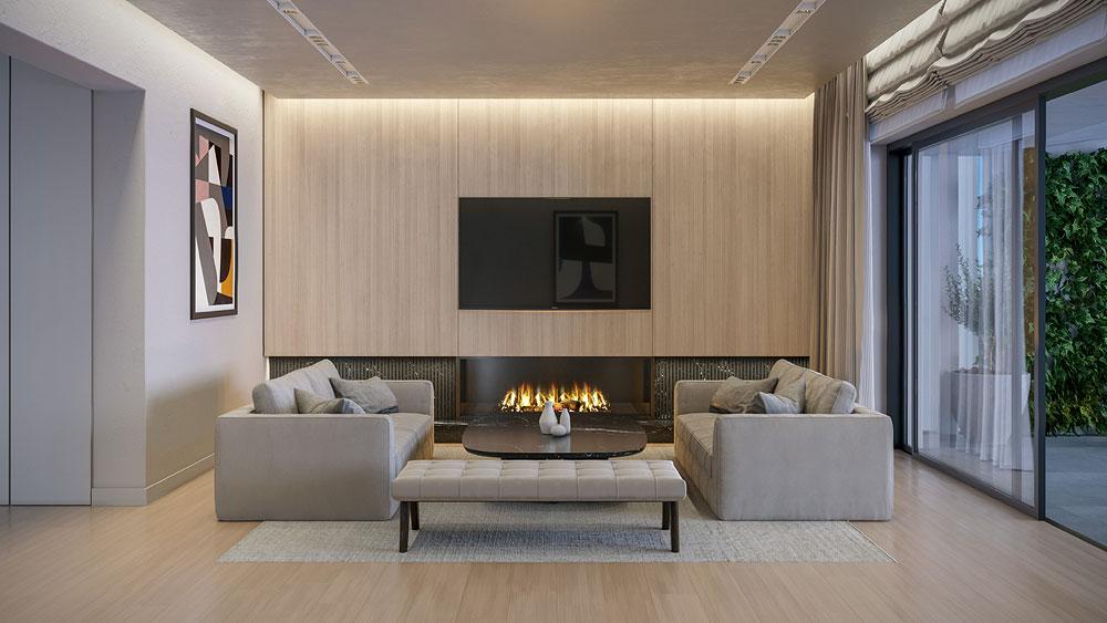 The interior features high-quality materials and finishes, including thermally broken aluminum fenestration by ELVIAL 6700, multi-split air conditioning by Daikin-VRV, and a choice of either a brick masonry built-in fireplace or a prefabricated one. Elevator access with advanced safety features by KLEEMAN ensures convenience and security.