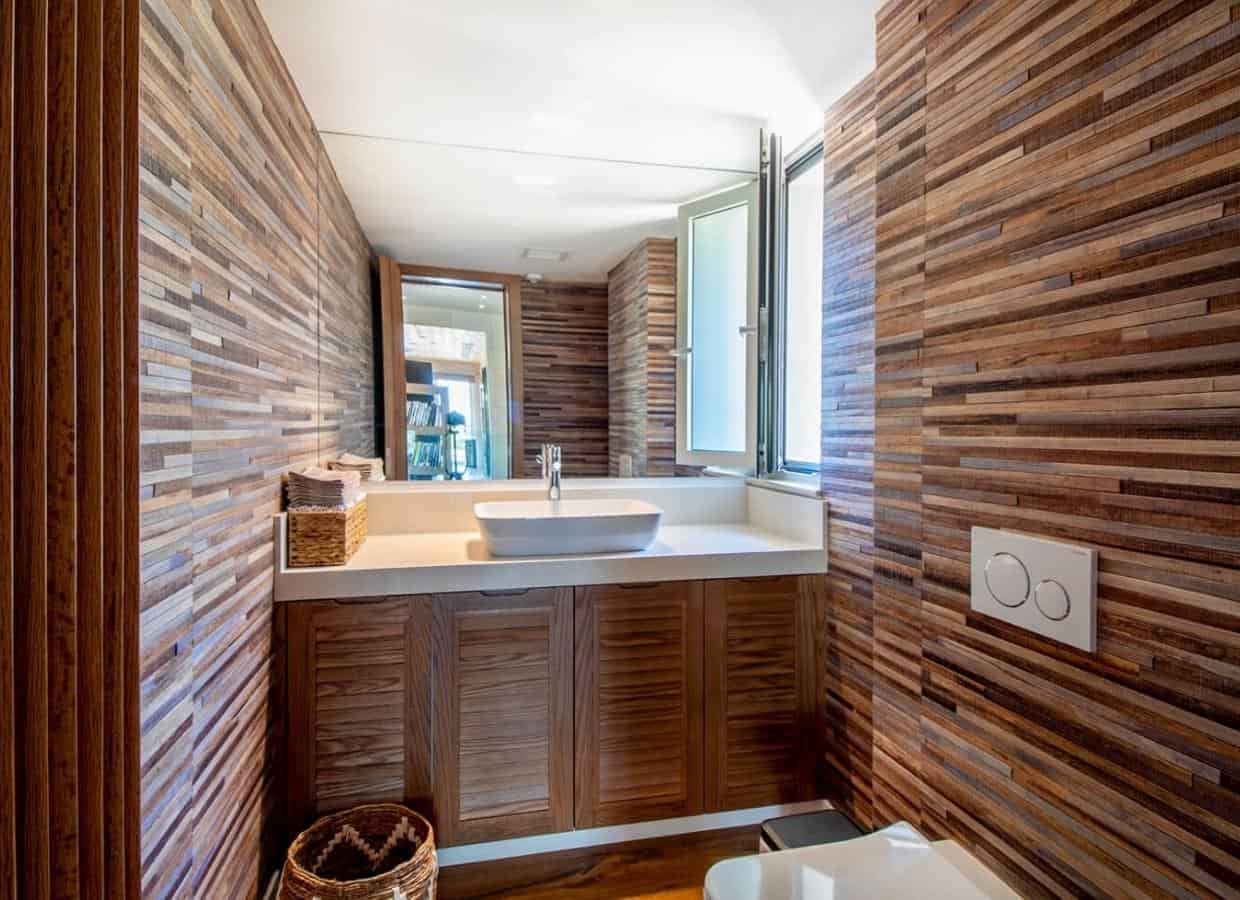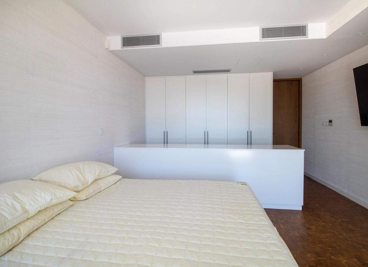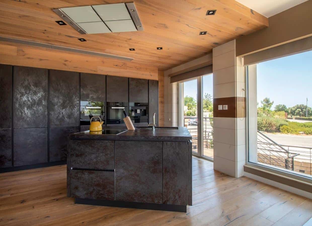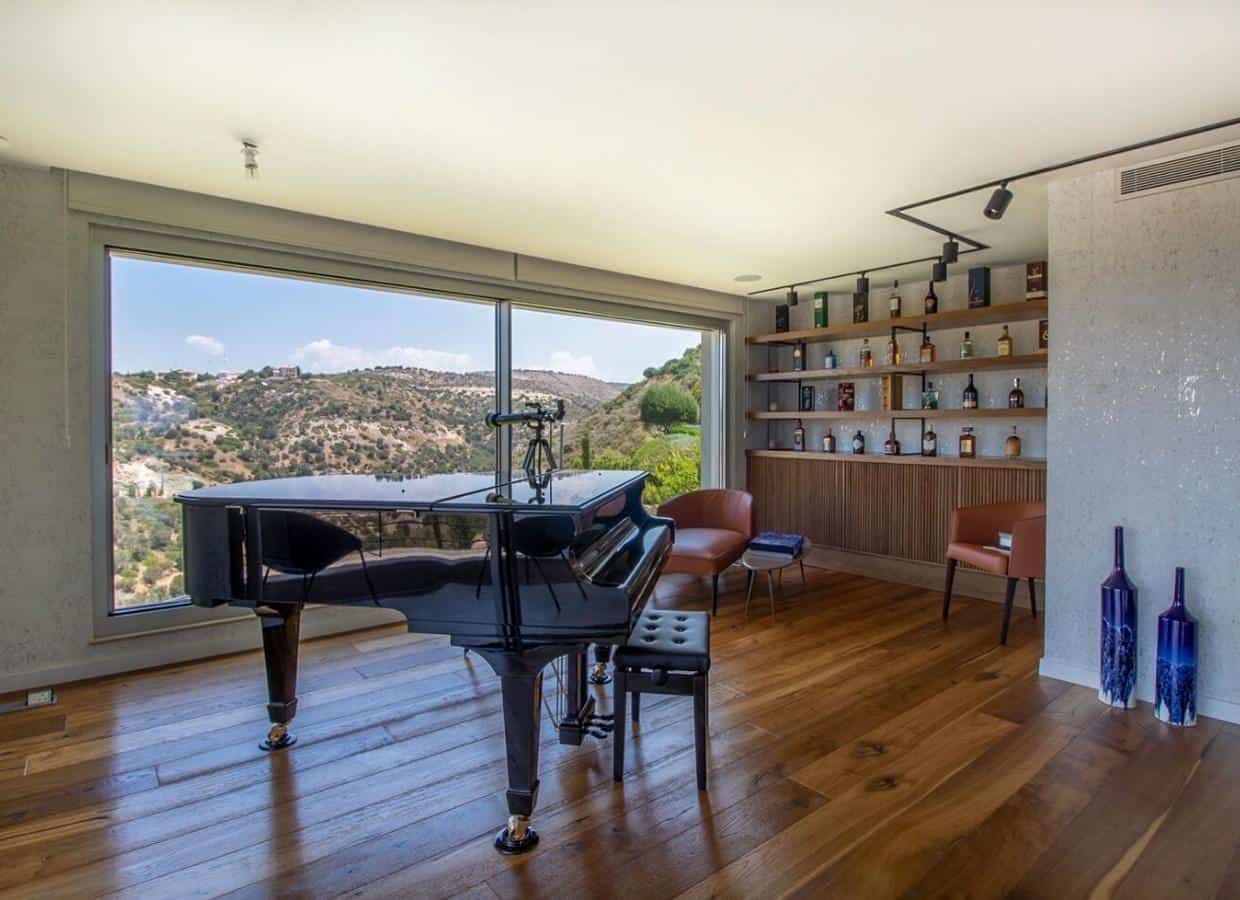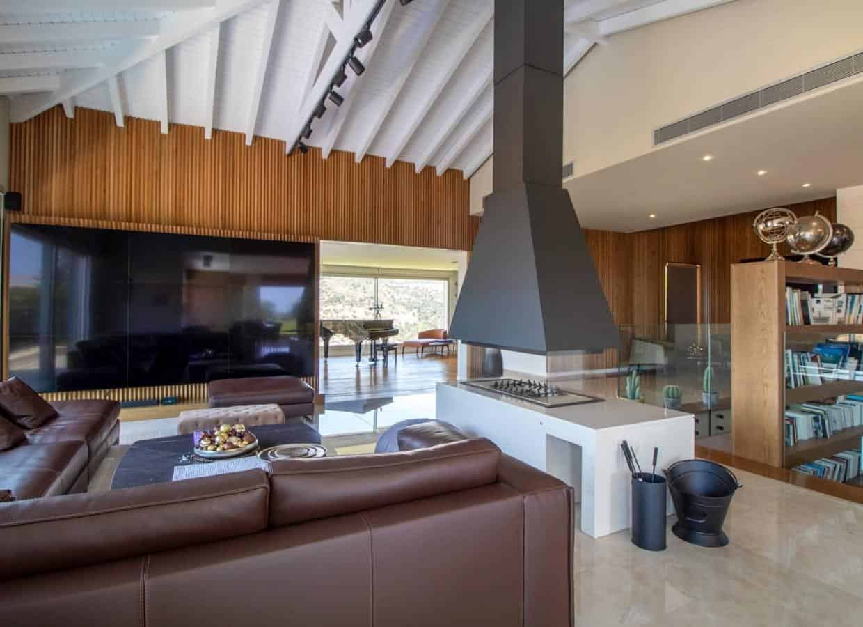 As you enter this splendid villa, a meticulously crafted timbered bridge guides you to the grand main entrance. The open-plan living, dining, and kitchen areas unfold seamlessly, showcasing a contemporary design that exemplifies sophistication. A modern free-standing fireplace is at the heart of the living space, creating a cozy ambiance. The kitchen, adorned with high-end fixtures and fittings, radiates elegance and functionality. Expansive terraces extend from the living and dining areas, offering sweeping panoramic views and complete serenity. The villa is equipped with concealed air conditioning, ensuring optimal comfort.