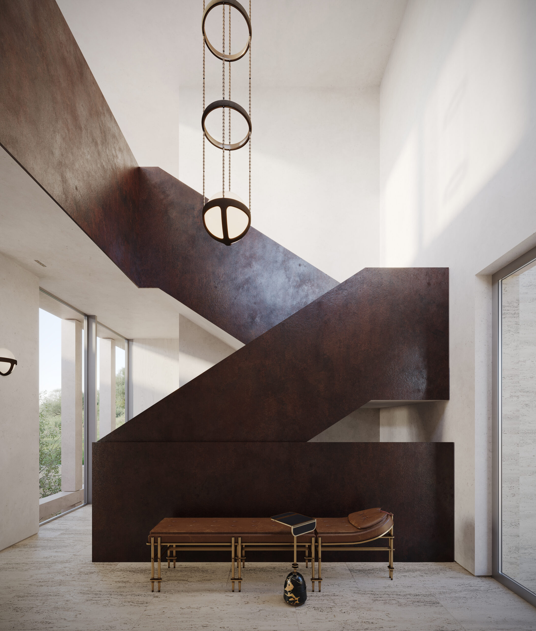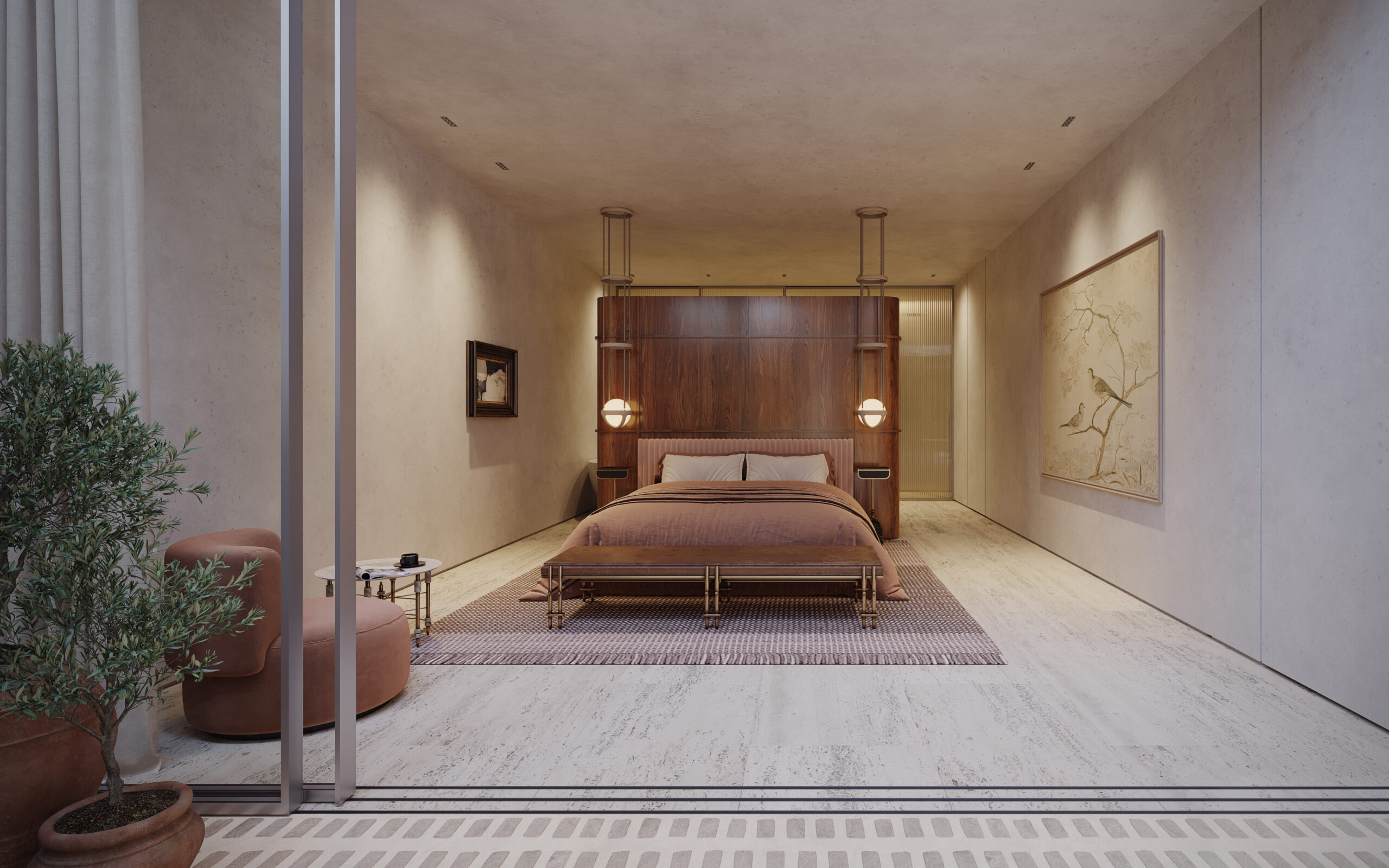 The main living space is open-plan and bathed in natural light, with retractable glass walls that open onto a large terrace, gardens, and a private swimming pool—creating a seamless connection between indoor elegance and outdoor splendor. The bespoke kitchen and refined dining area are ideal for entertaining, while a separate bedroom wing ensures privacy and calm. The dramatic seven-meter-high concourse leads to the first-floor master suite tower, offering stunning sea views and access to a secluded upper garden and pergola—perfect for intimate gatherings or peaceful reflection.