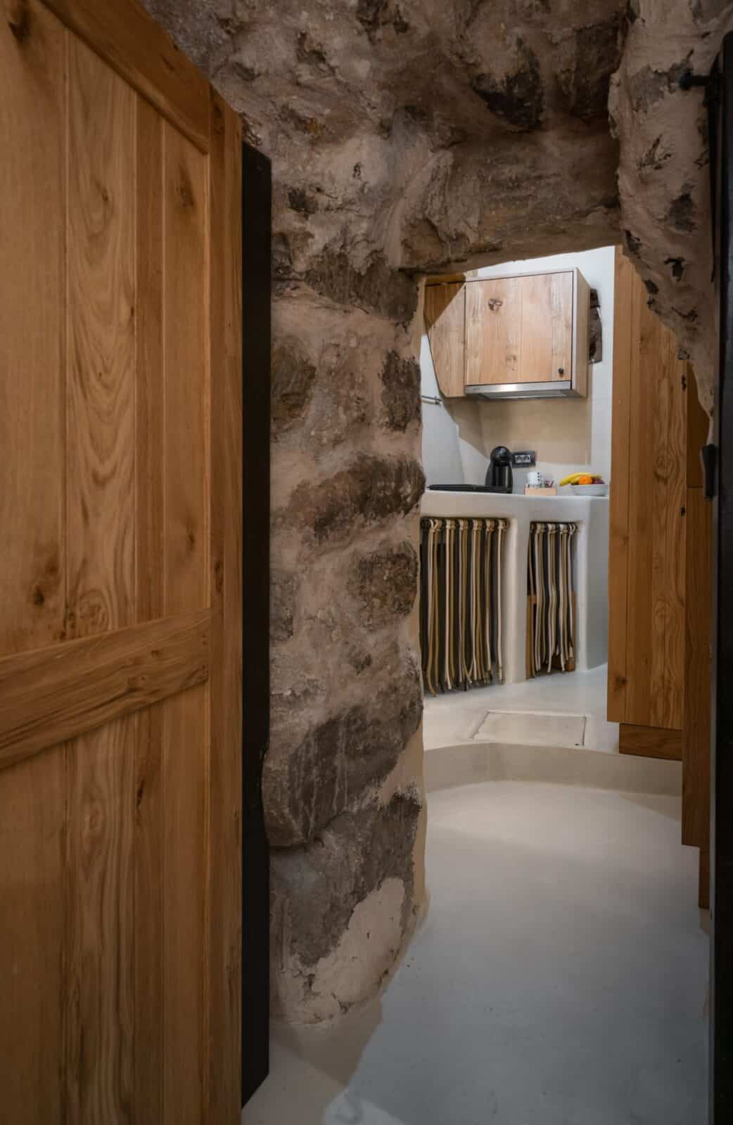 The Cave house consists of a large living room, a bedroom, a large wardrobe room, kitchen area, WC and a snow-white spacious shower “room” with artificial lighting, which creates a feeling of relaxation and exposure to the Cycladic sun. The terrace with the built-in lounge and the chaise lounges is an idyllic relaxation space. There is a modern, timed ventilation system in all its rooms. The wardrobe room can be used as an additional bedroom.