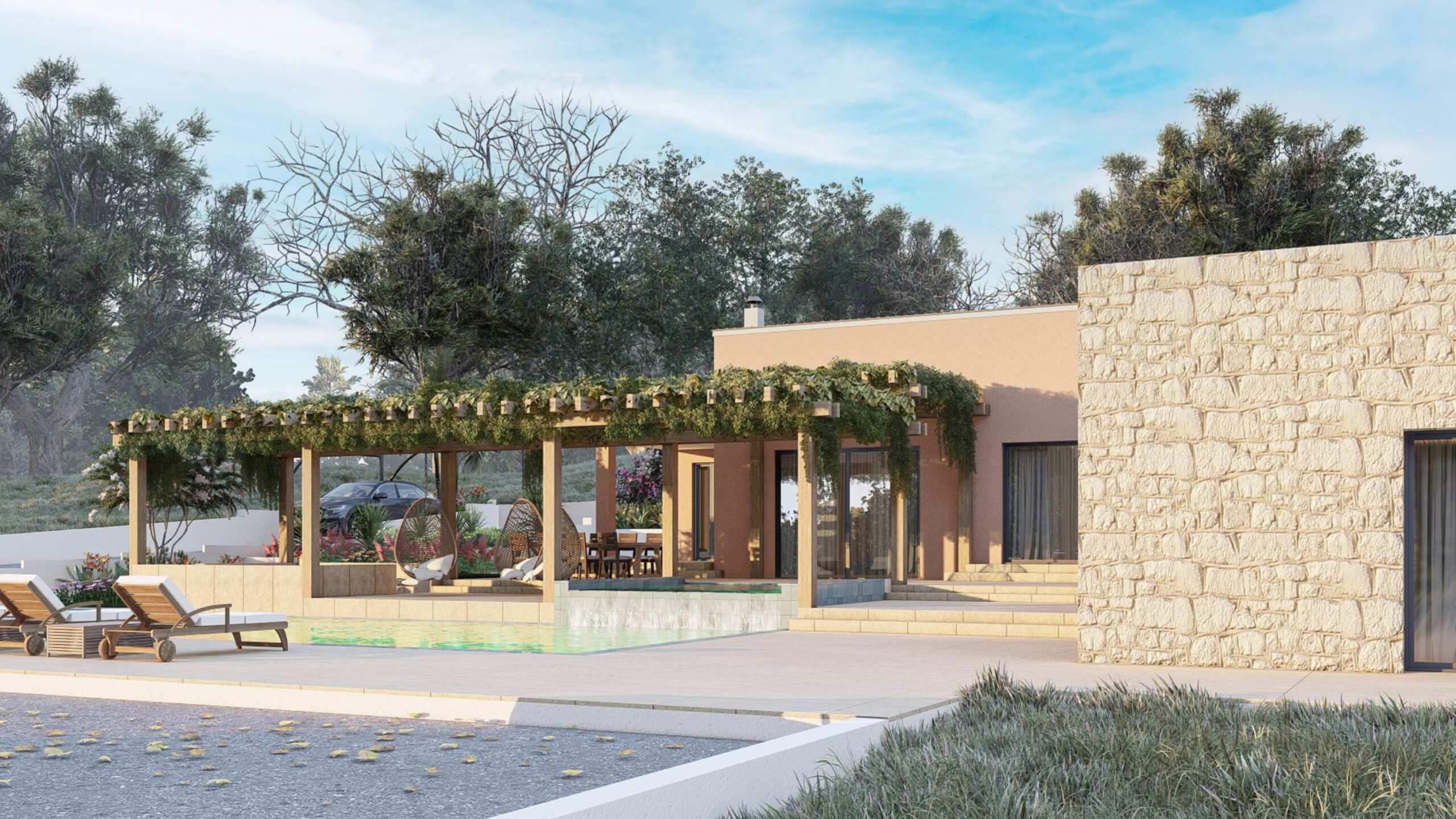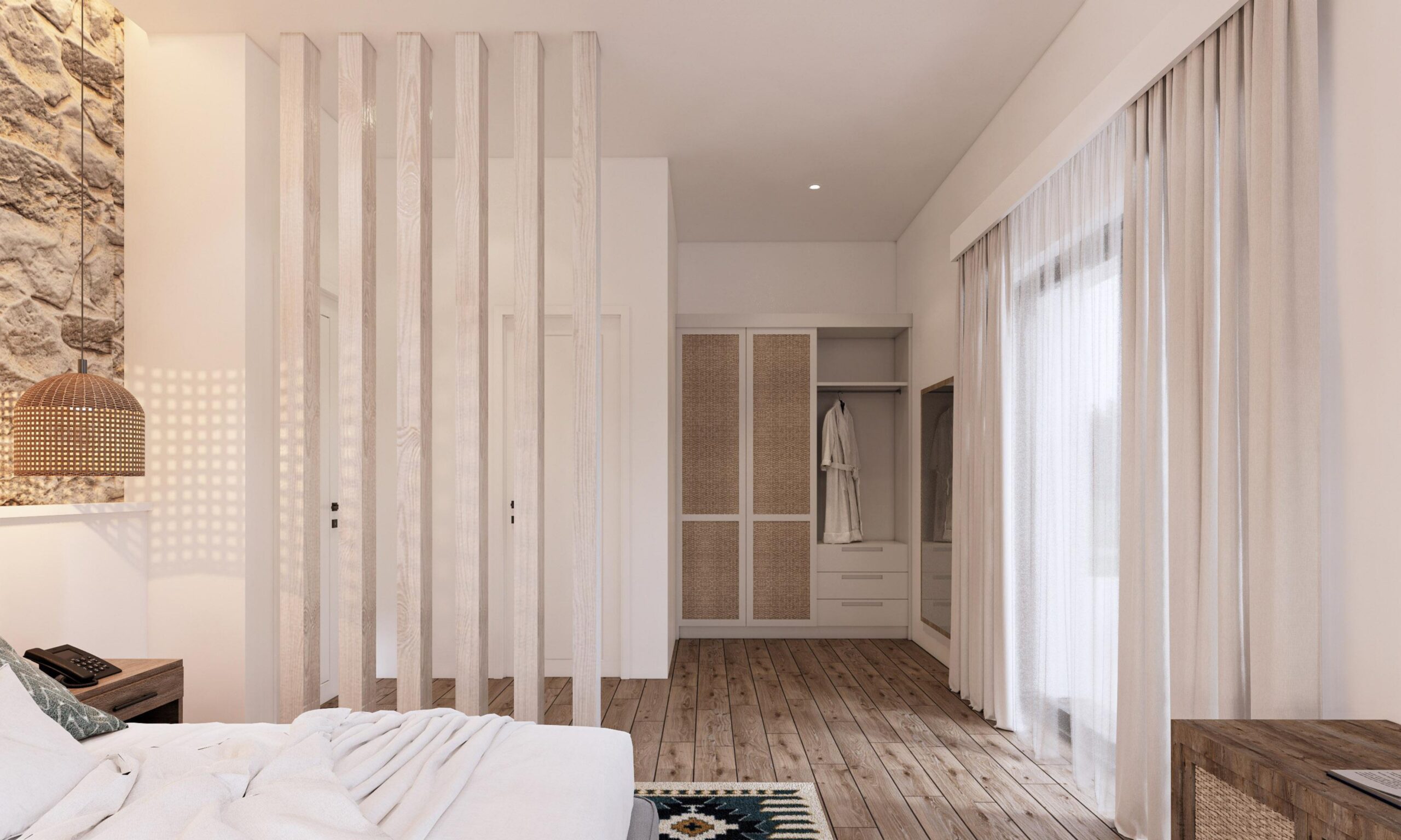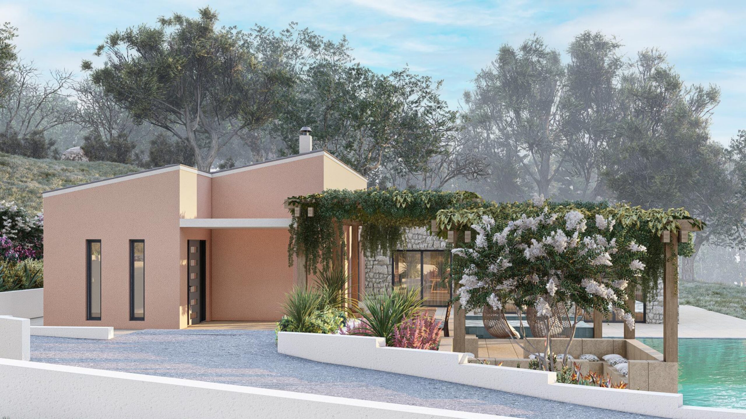 Step outside into a meticulously crafted outdoor oasis where relaxation and sophistication come together. A shimmering swimming pool and luxurious jacuzzi invite you to unwind in style, while a dedicated fire lounge area offers a warm and intimate setting for evening gatherings. The BBQ and al fresco dining area provide the perfect space for entertaining guests or enjoying quiet dinners under the stars. The villa’s exterior design will harmonize with its surroundings, complementing the natural beauty of Agios Georgios North and offering the perfect balance of modern comfort and rustic charm.