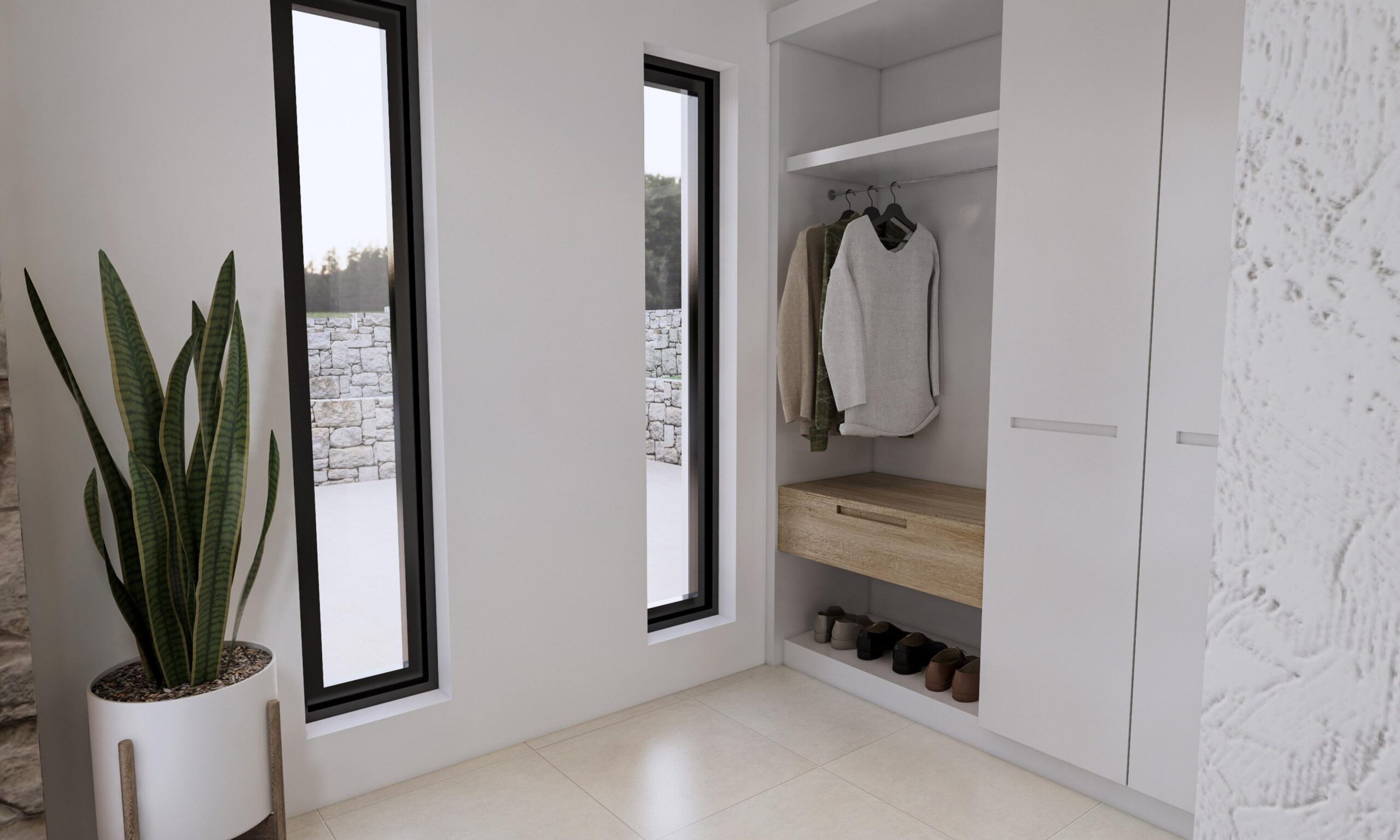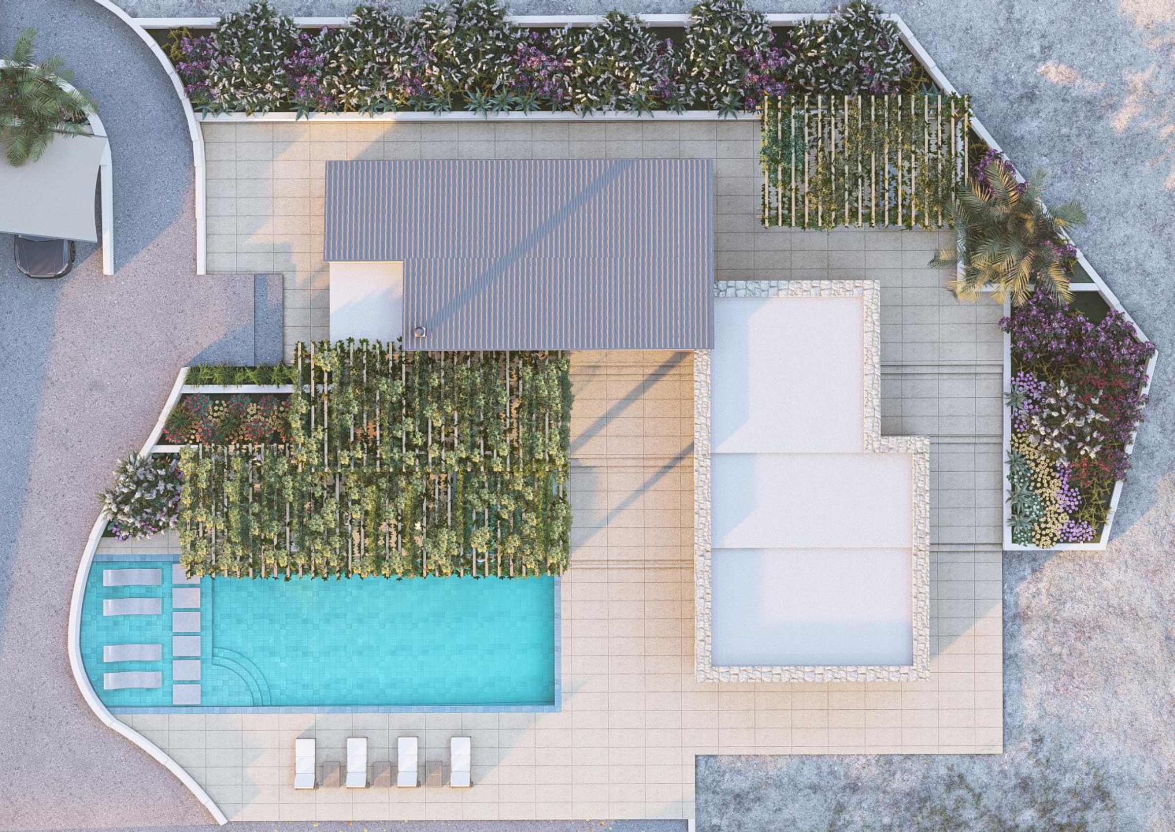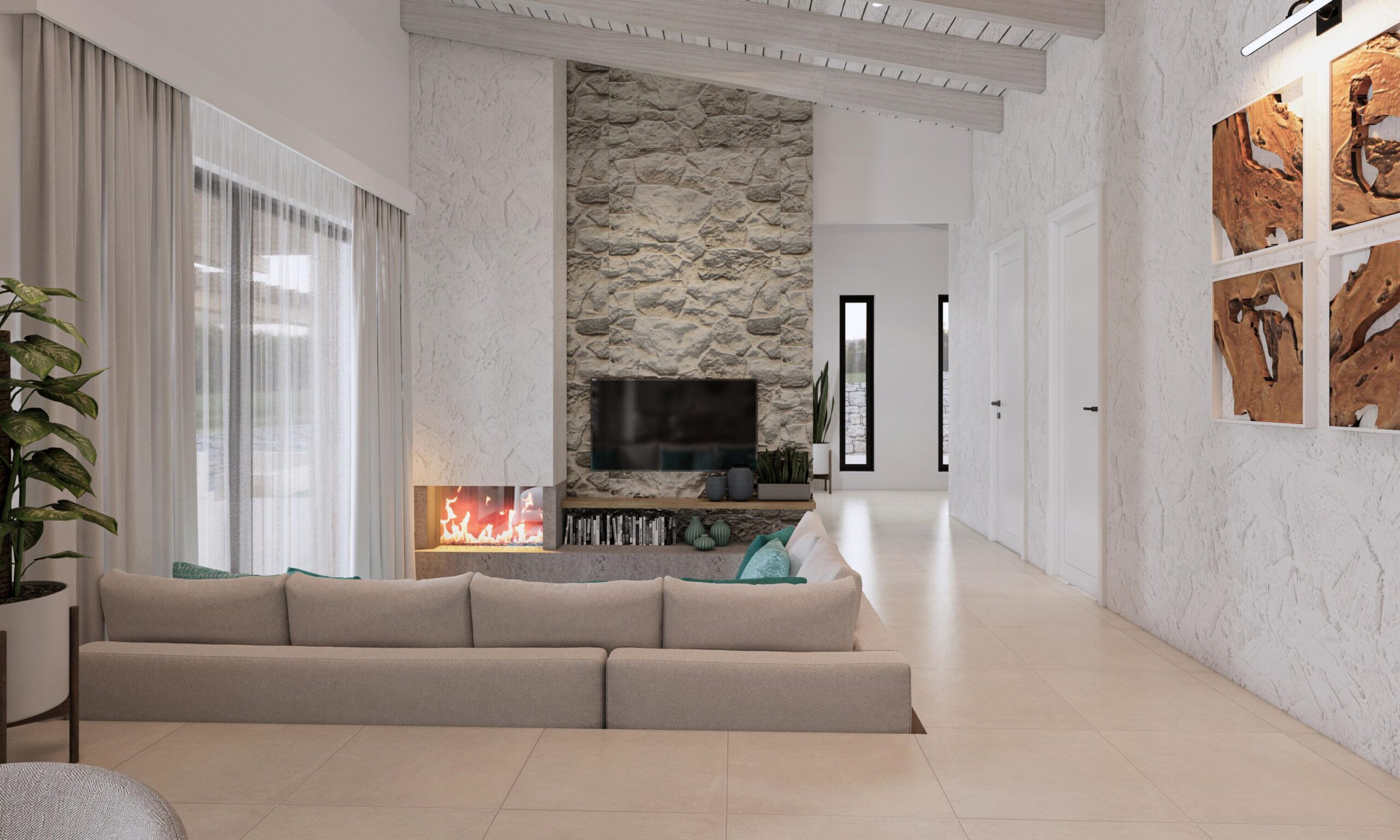 Step outside into a meticulously crafted outdoor oasis where relaxation and sophistication come together. A shimmering swimming pool and luxurious jacuzzi invite you to unwind in style, while a dedicated fire lounge area offers a warm and intimate setting for evening gatherings. The BBQ and al fresco dining area provide the perfect space for entertaining guests or enjoying quiet dinners under the stars. The villa’s exterior design will harmonize with its surroundings, complementing the natural beauty of Agios Georgios North and offering the perfect balance of modern comfort and rustic charm.