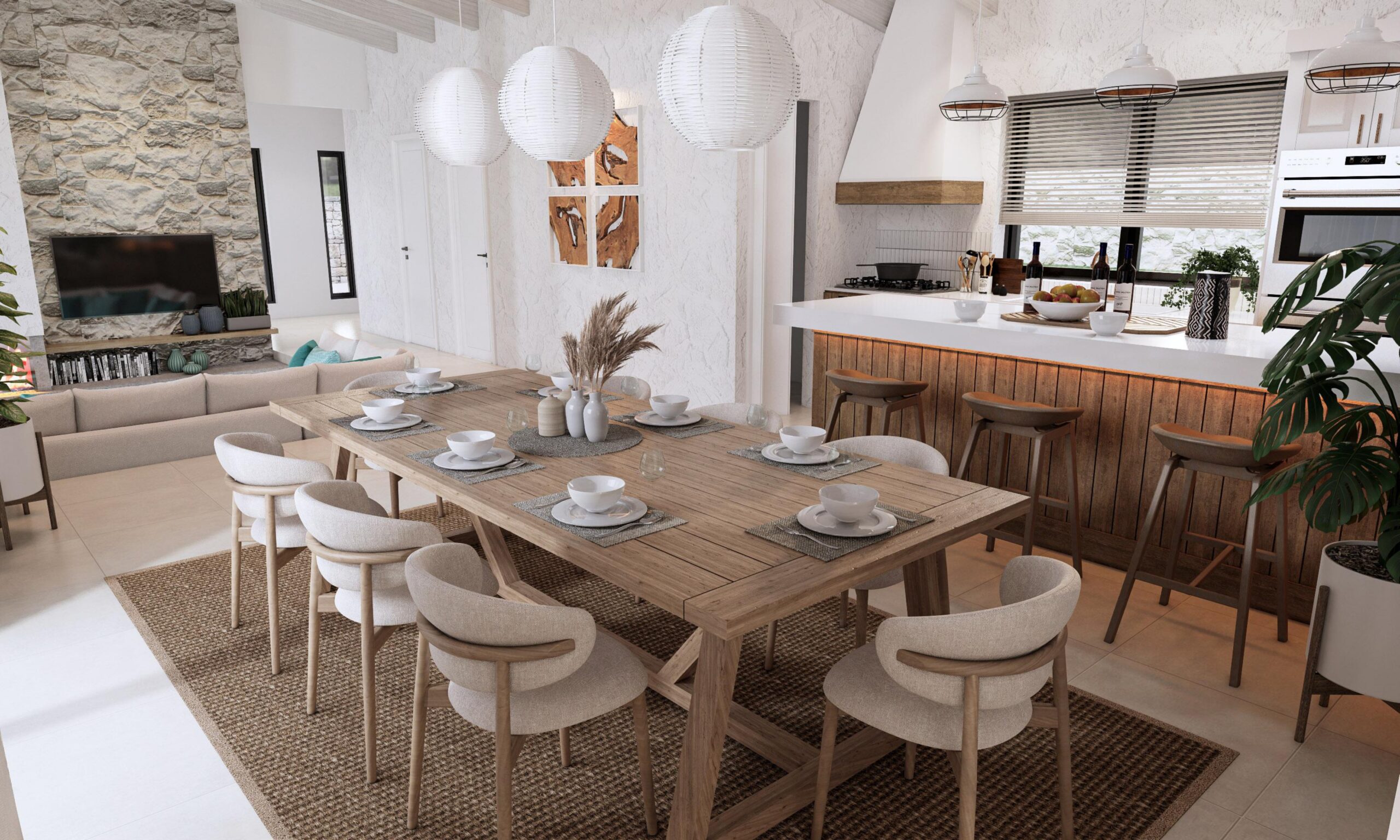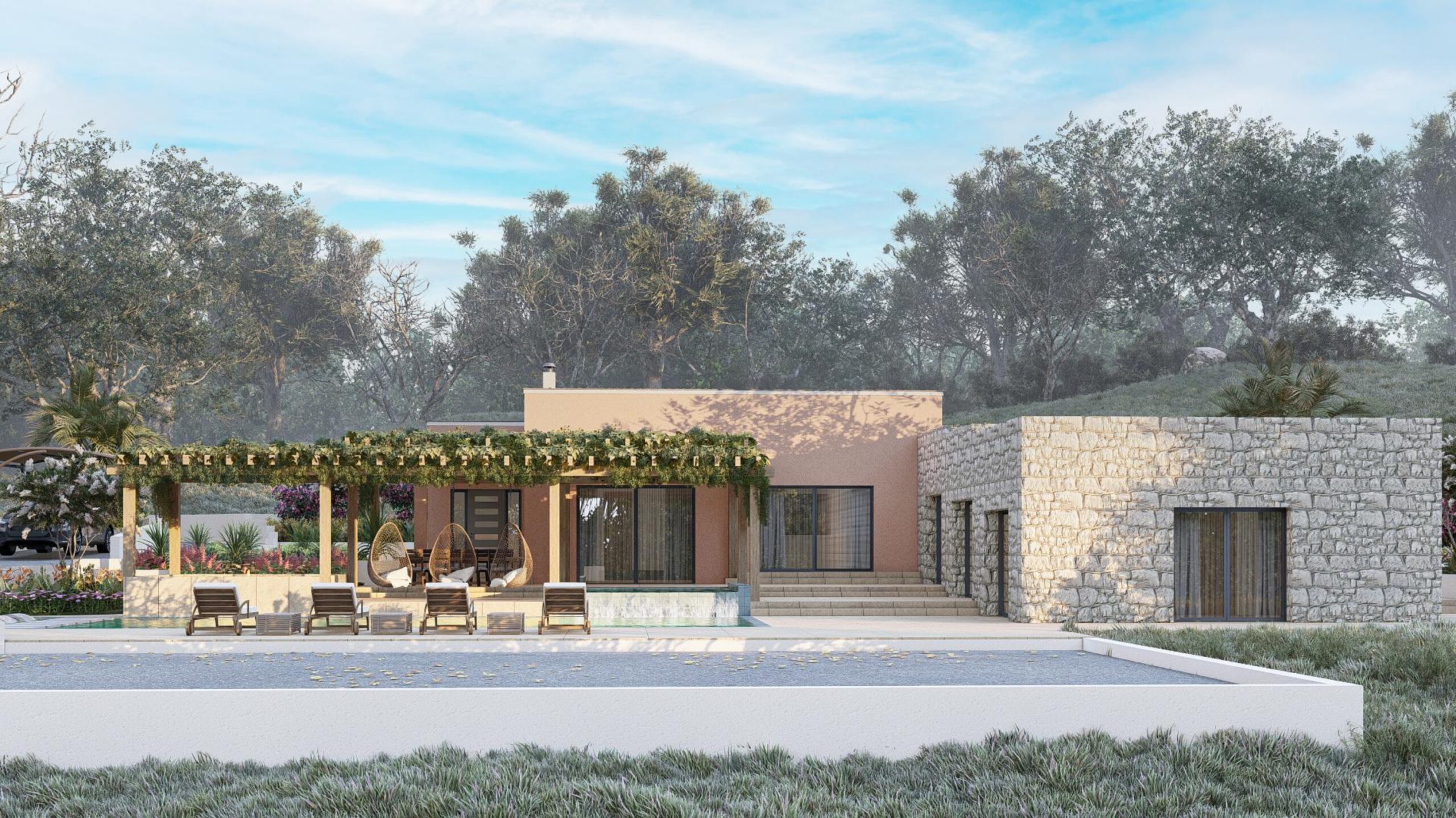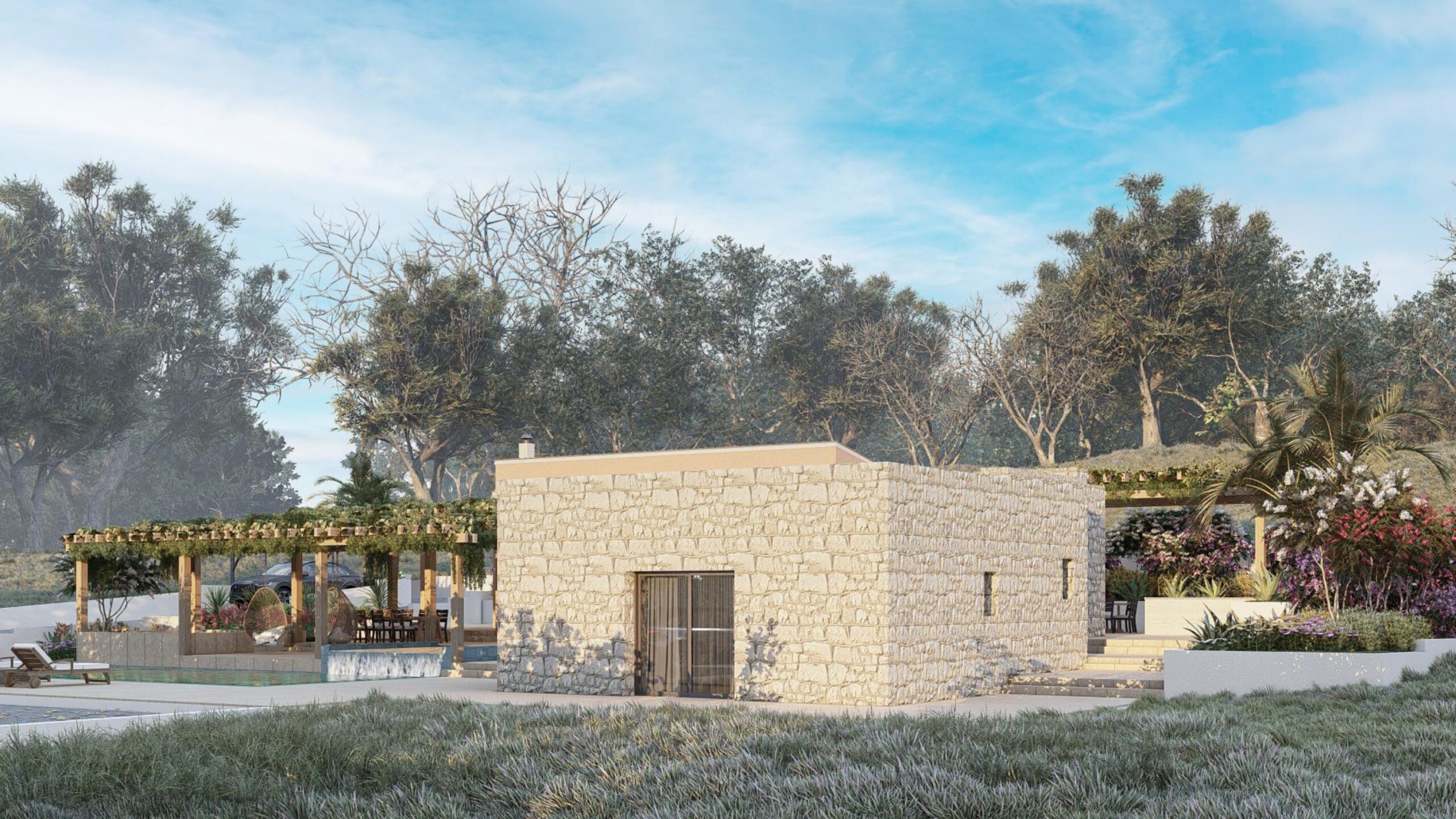 The ground floor of the villa will feature three spacious bedrooms, including two master suites, each with its own private en-suite bathroom, providing an atmosphere of personal sanctuary. An additional guest bathroom ensures convenience and privacy for all guests. The heart of the home lies in the open-concept kitchen, thoughtfully designed for both functionality and style, complete with a practical pantry. The kitchen flows seamlessly into a charming dining area, while the expansive living room, adorned with rustic touches, serves as a cozy space for relaxation and socializing.