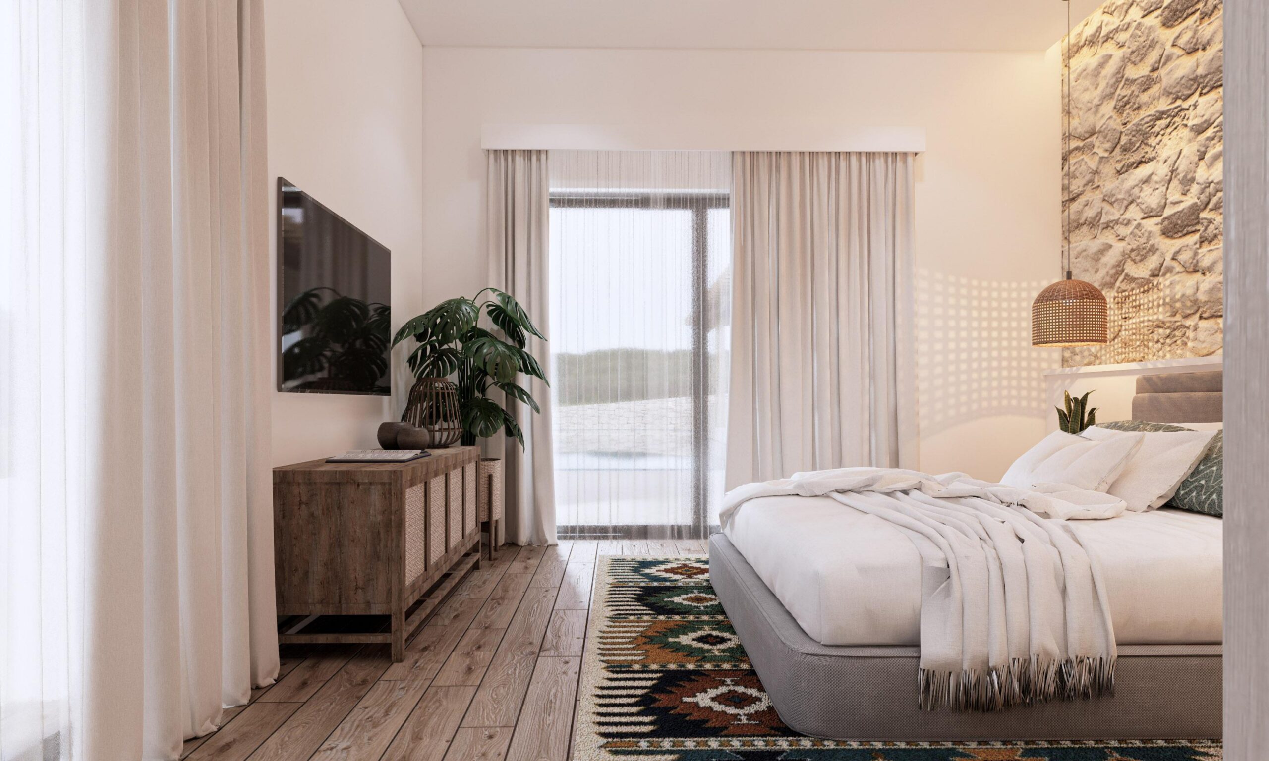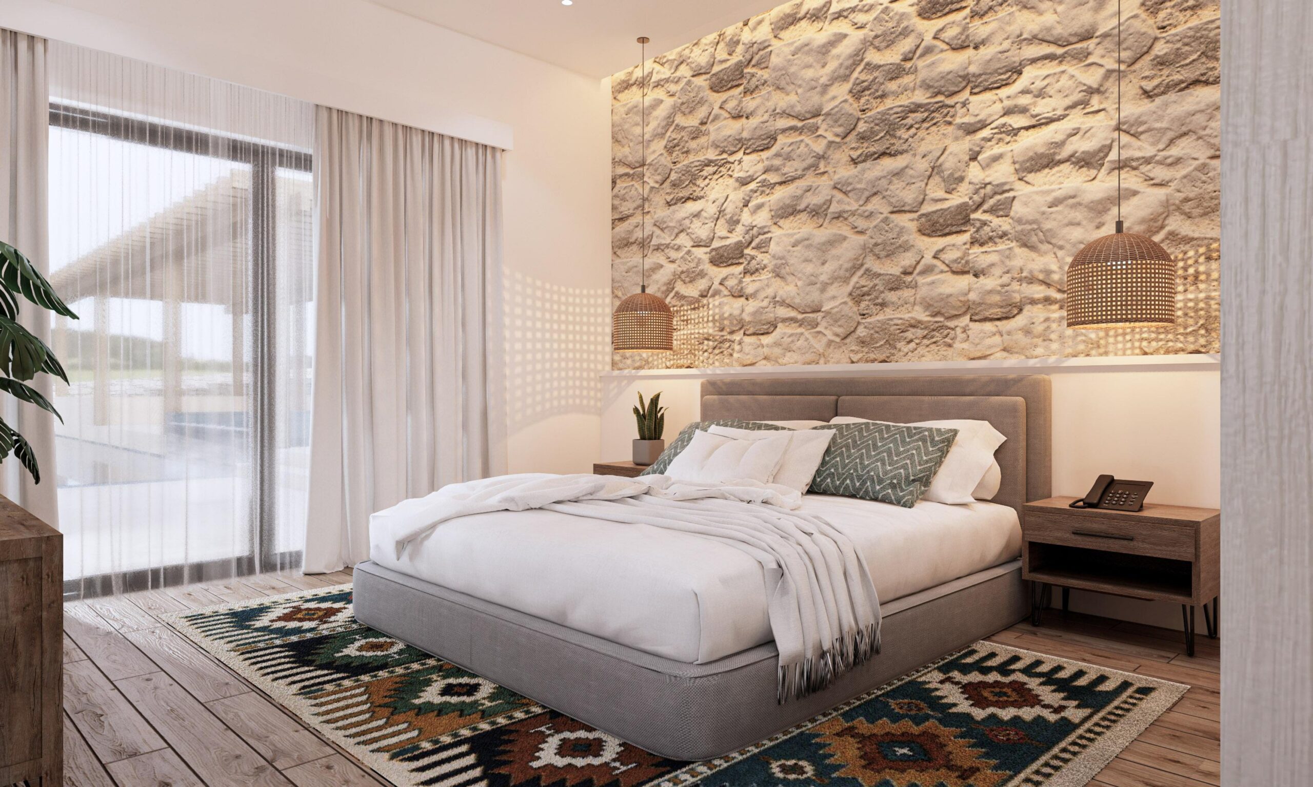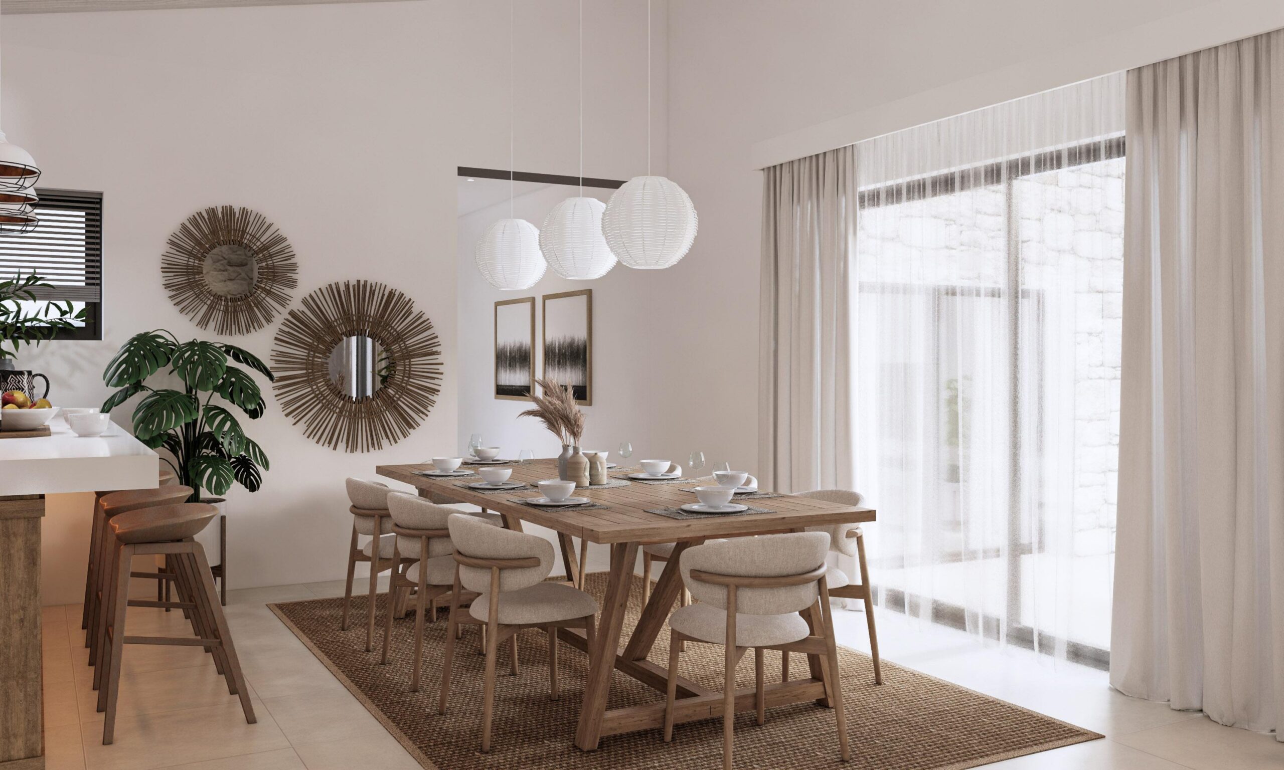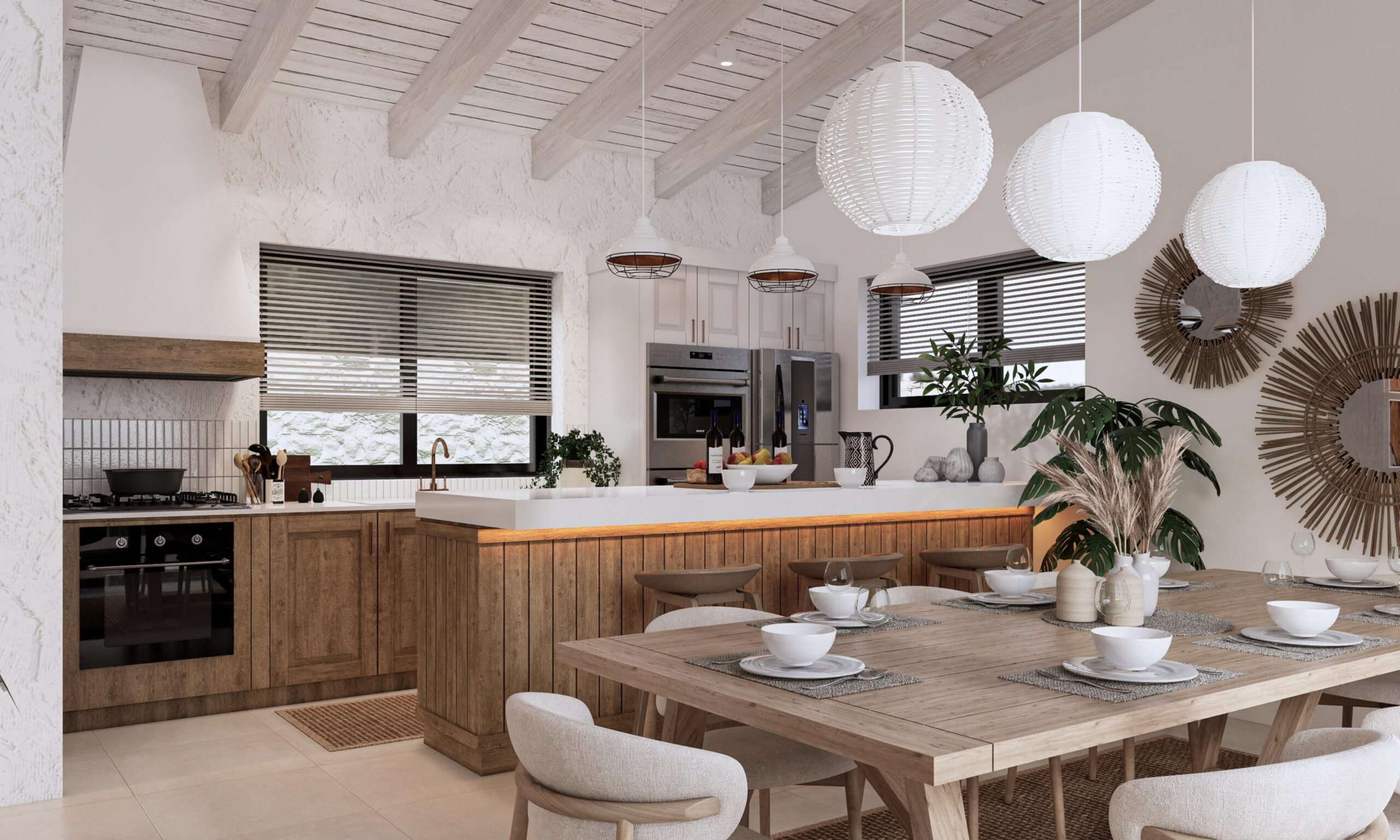 The ground floor of the villa will feature three spacious bedrooms, including two master suites, each with its own private en-suite bathroom, providing an atmosphere of personal sanctuary. An additional guest bathroom ensures convenience and privacy for all guests. The heart of the home lies in the open-concept kitchen, thoughtfully designed for both functionality and style, complete with a practical pantry. The kitchen flows seamlessly into a charming dining area, while the expansive living room, adorned with rustic touches, serves as a cozy space for relaxation and socializing.