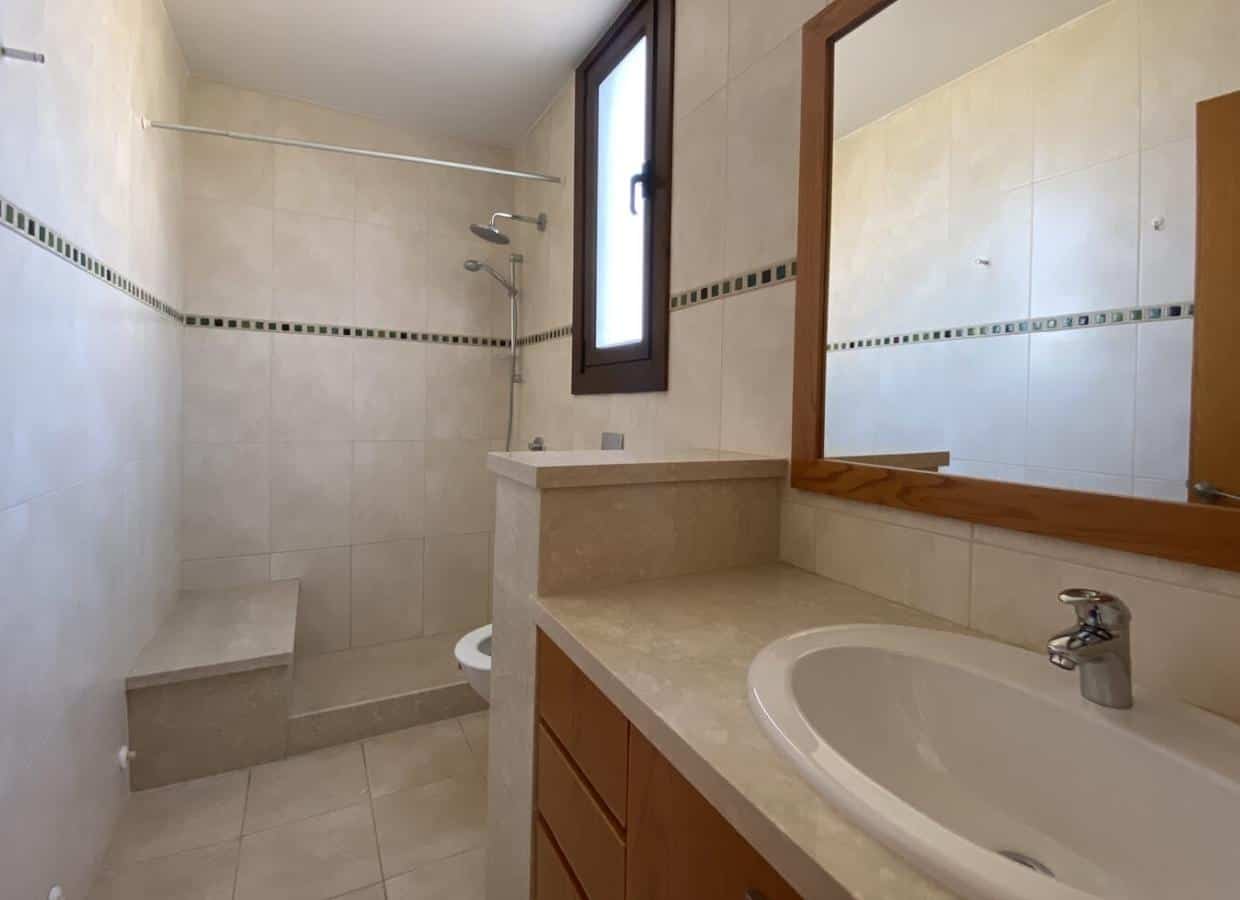 Traditional Cypriot landscaping graces the gardens upon stepping outside, creating a serene and private outdoor living space. The Villa’s exterior showcases Villa’s fantastic BBQ area, perfect for entertaining, and a large overflow swimming pool, inviting residents to enjoy leisurely moments in the Mediterranean sun. A double-covered carport awaits at the entrance, accompanied by additional parking space to the right, ensuring convenience for residents and guests.