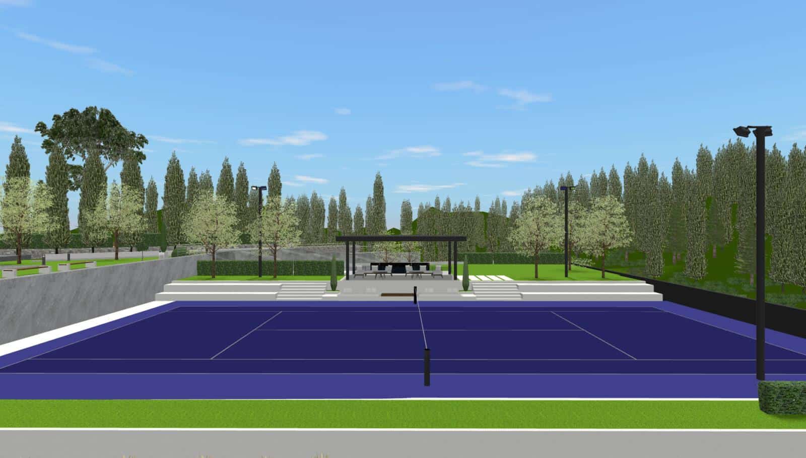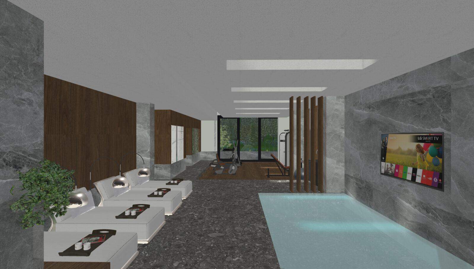 The external spaces feature balconies, the main terrace lounge, and the pool level, boasting two heated swimming pools, a hot tub, an outdoor cinema, a bar, and an alfresco dining area. A private tennis and basketball court and a generous parking space south of the main entrance are included.