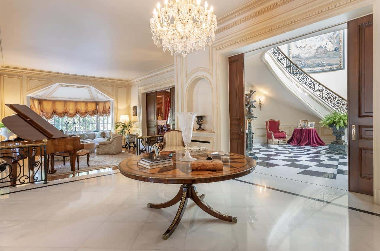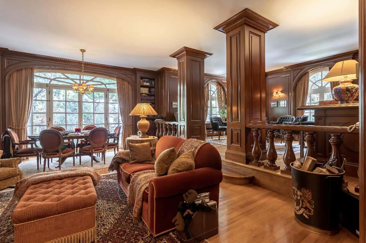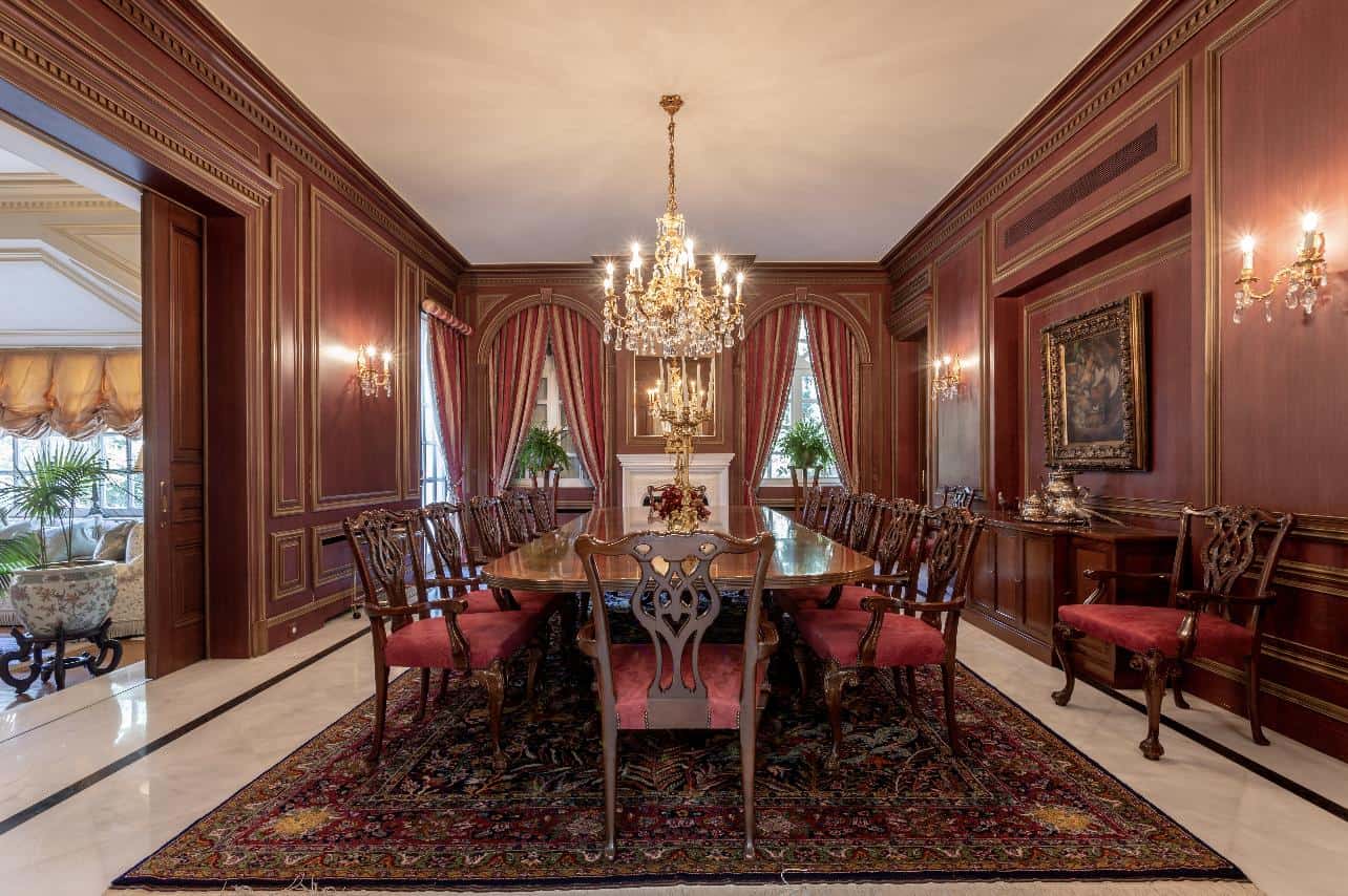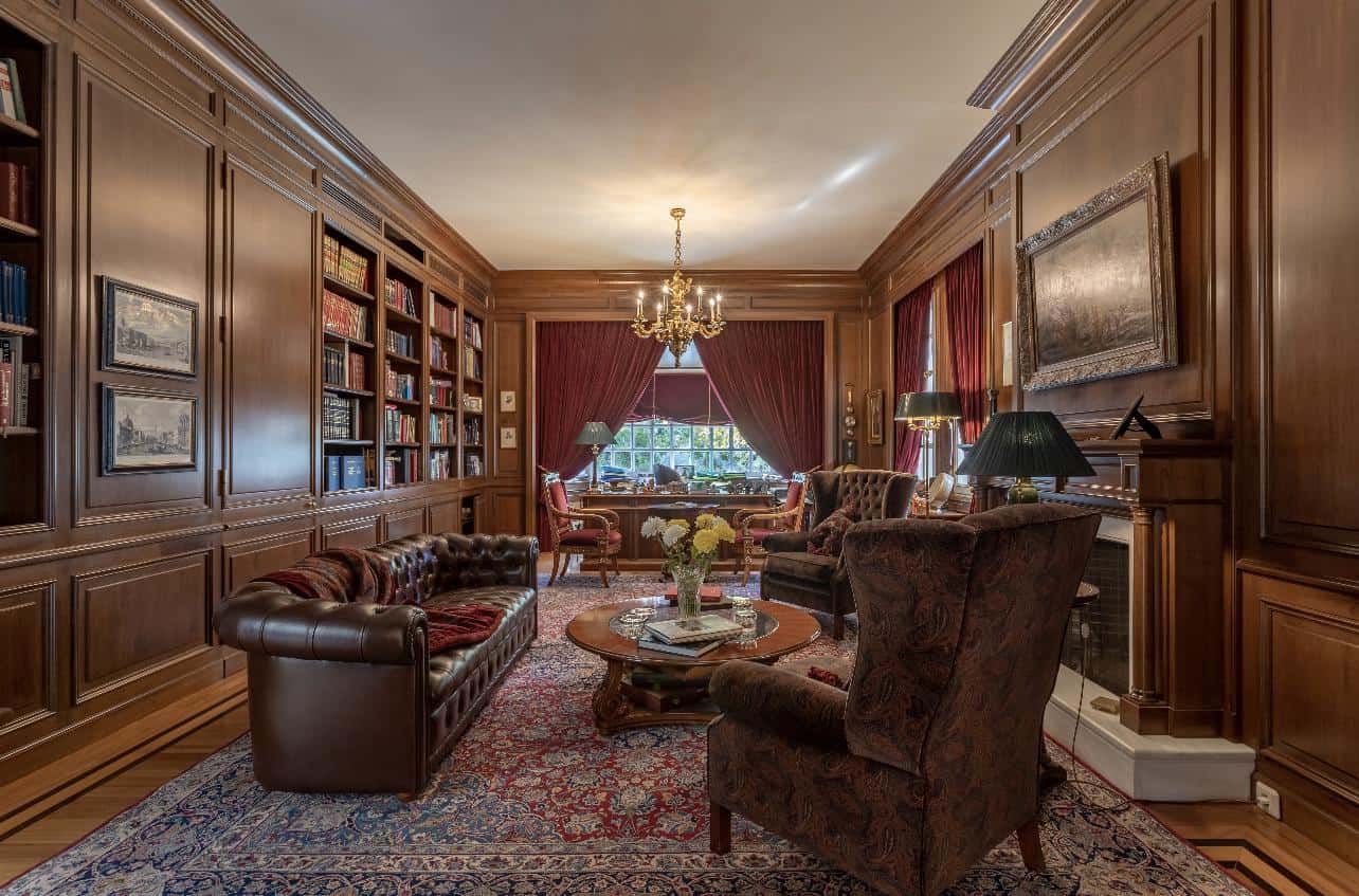 The interior exudes an aristocratic ambiance, with tastefully furnished living quarters showcasing the finest classical design. The spacious living and dining rooms, adorned with exquisite decorative elements, provide an elegant setting for grand gatherings and intimate moments. A well-appointed library and a captivating fireplace add to the home’s timeless charm, creating spaces inviting relaxation and intellectual pursuits.