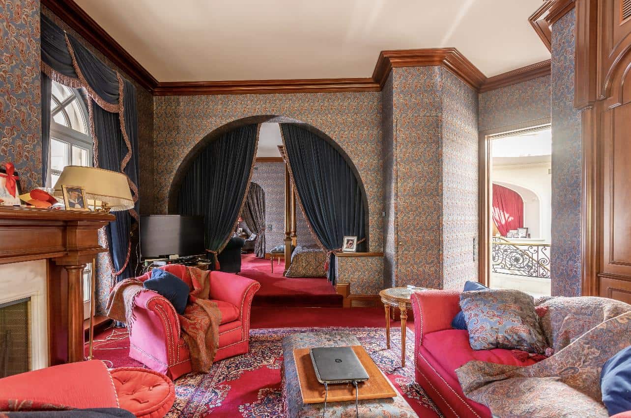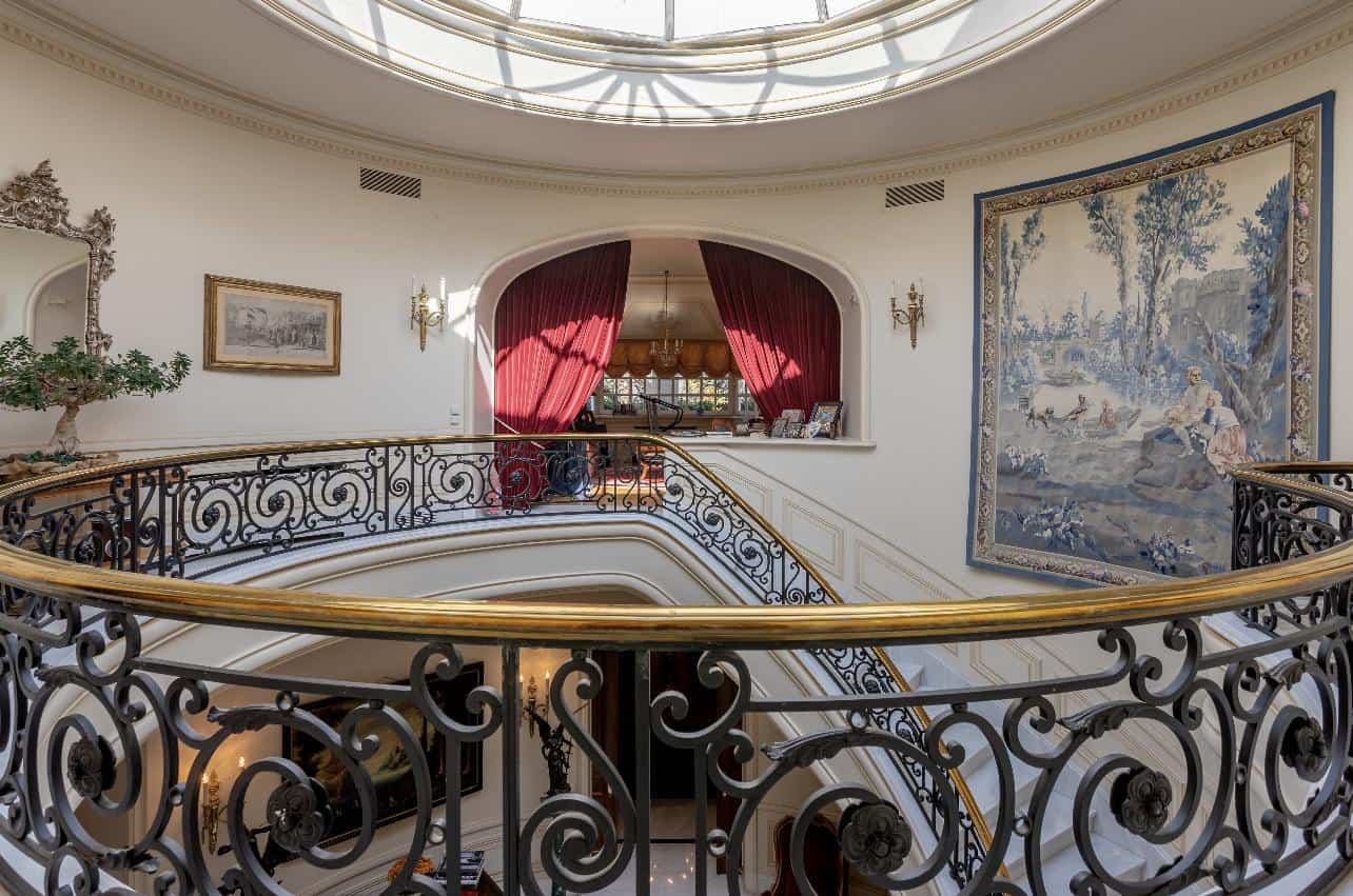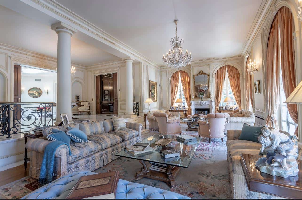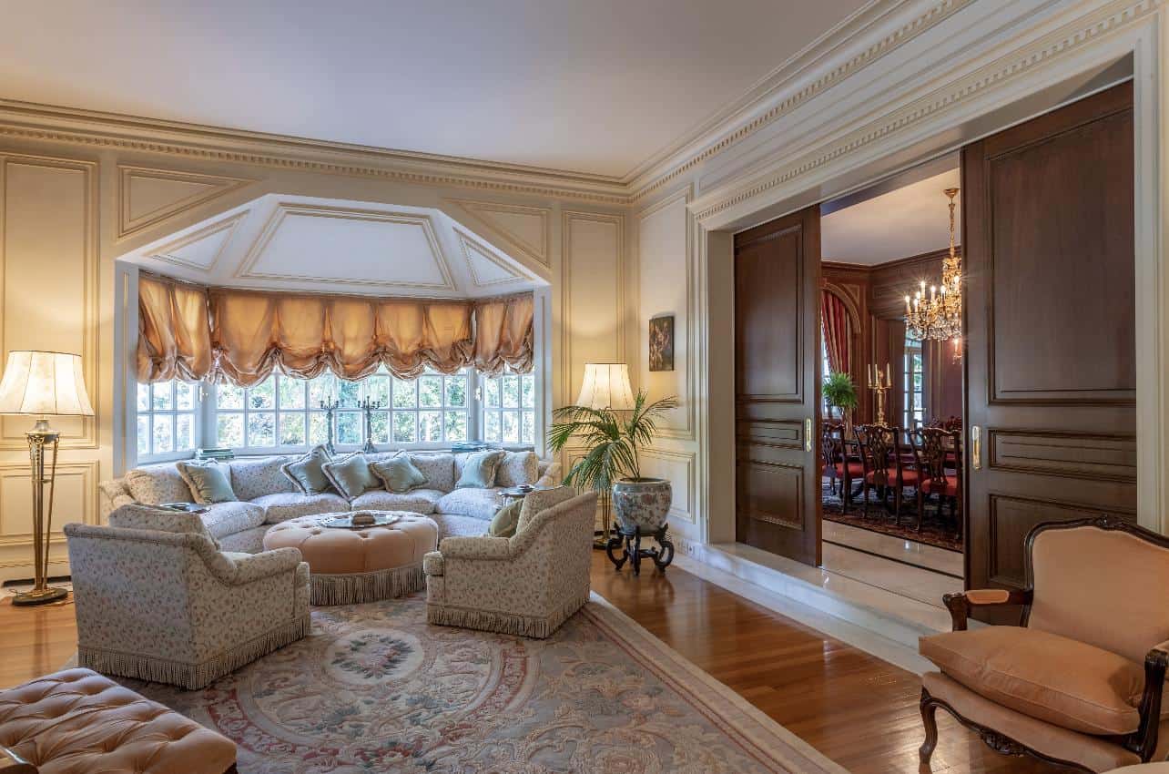 The interior exudes an aristocratic ambiance, with tastefully furnished living quarters showcasing the finest classical design. The spacious living and dining rooms, adorned with exquisite decorative elements, provide an elegant setting for grand gatherings and intimate moments. A well-appointed library and a captivating fireplace add to the home’s timeless charm, creating spaces inviting relaxation and intellectual pursuits.