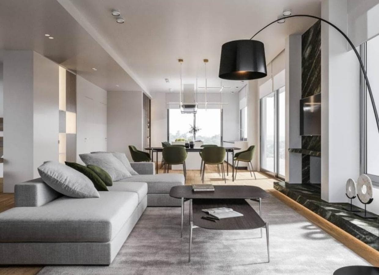 The modern Piazzetta fireplace adds coziness and warmth to the interior: when it gets cool outside, it will be cozy and warm here! All this forms one space where the family can comfortably spend a lot of time. There is also one living room on the main floor, which can serve as an office or a guest room and a bathroom.