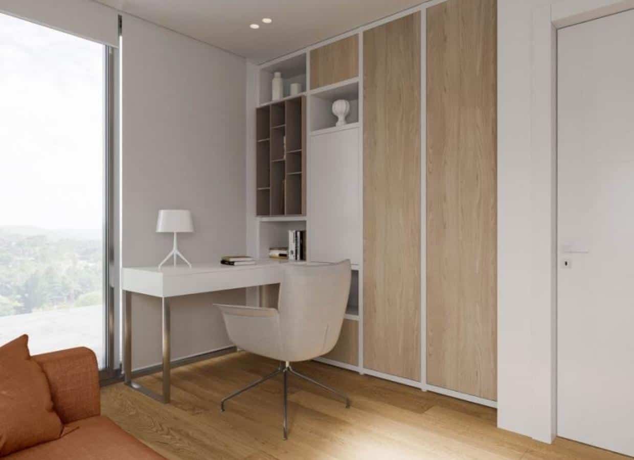 On the second floor of 100m2, you can find three bedrooms and two bathrooms. The Master bedroom has access to a separate ensuite bathroom and a large wardrobe. There is also a 16 m2 balcony, which can be used as an additional space for work, rest, or sports. The floor of the bedrooms is made of oak parquet. All bedrooms have panoramic windows that offer stunning sea views.
