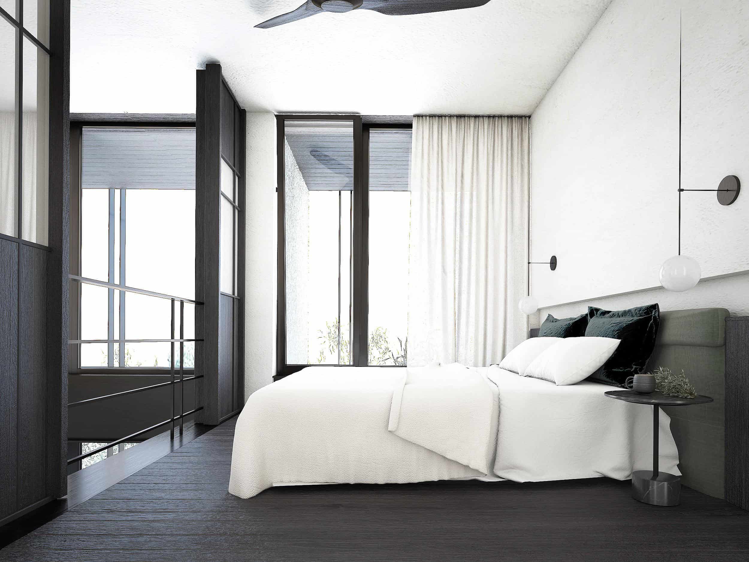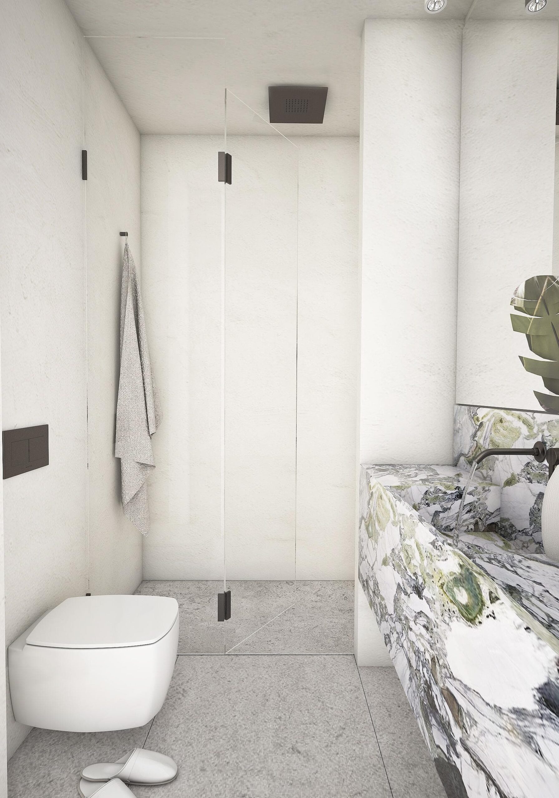 The exterior and interior designs have been meticulously honed to perfection, resulting in a cohesive and harmonious entity with a clear and unified vision. The crisp façade showcases two varieties of light-colored, handcrafted plasterwork – smooth and textured. These elegant finishes are complemented by clean, well-defined lines and a bold grid formed by the sequence of windows and terraces. The interplay of gray and off-white plaster is artfully juxtaposed with the dark wood and metal framing on windows and fences, adding further depth and definition to the overall composition.