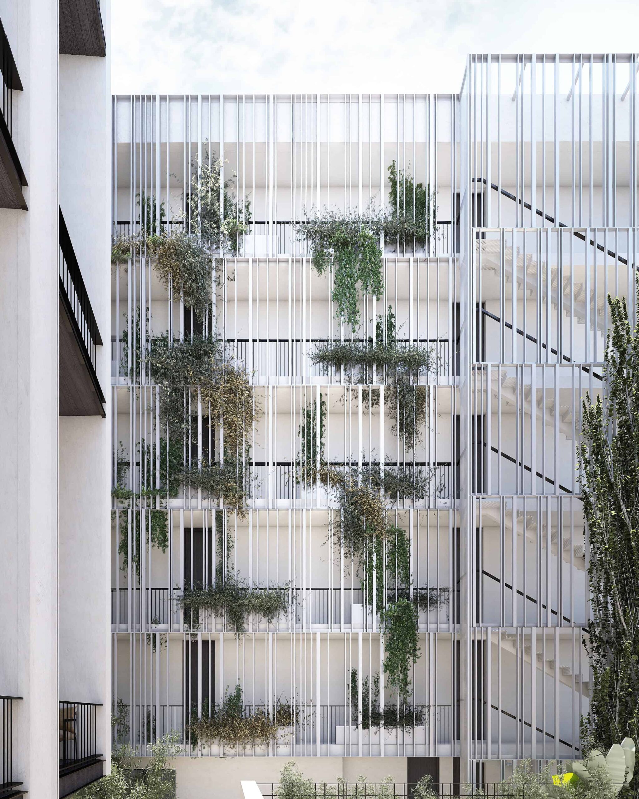 The design philosophy skillfully balances the development’s substantial scale with meticulous attention to detail, an inviting sense of openness, and abundant outdoor spaces. At the heart of this architectural masterpiece lies a central atrium, drawing in natural light deep into the interior spaces. At the same time, a generously proportioned, semi-open circulation network takes full advantage of Athens’ temperate climate year-round. This thoughtful approach fosters welcoming communal areas and ensures ample breathing room for residents. The ground floor entrance lobby features perforated concrete block walls, allowing light and air to permeate the building’s base, which is gracefully elevated on pilotis.
