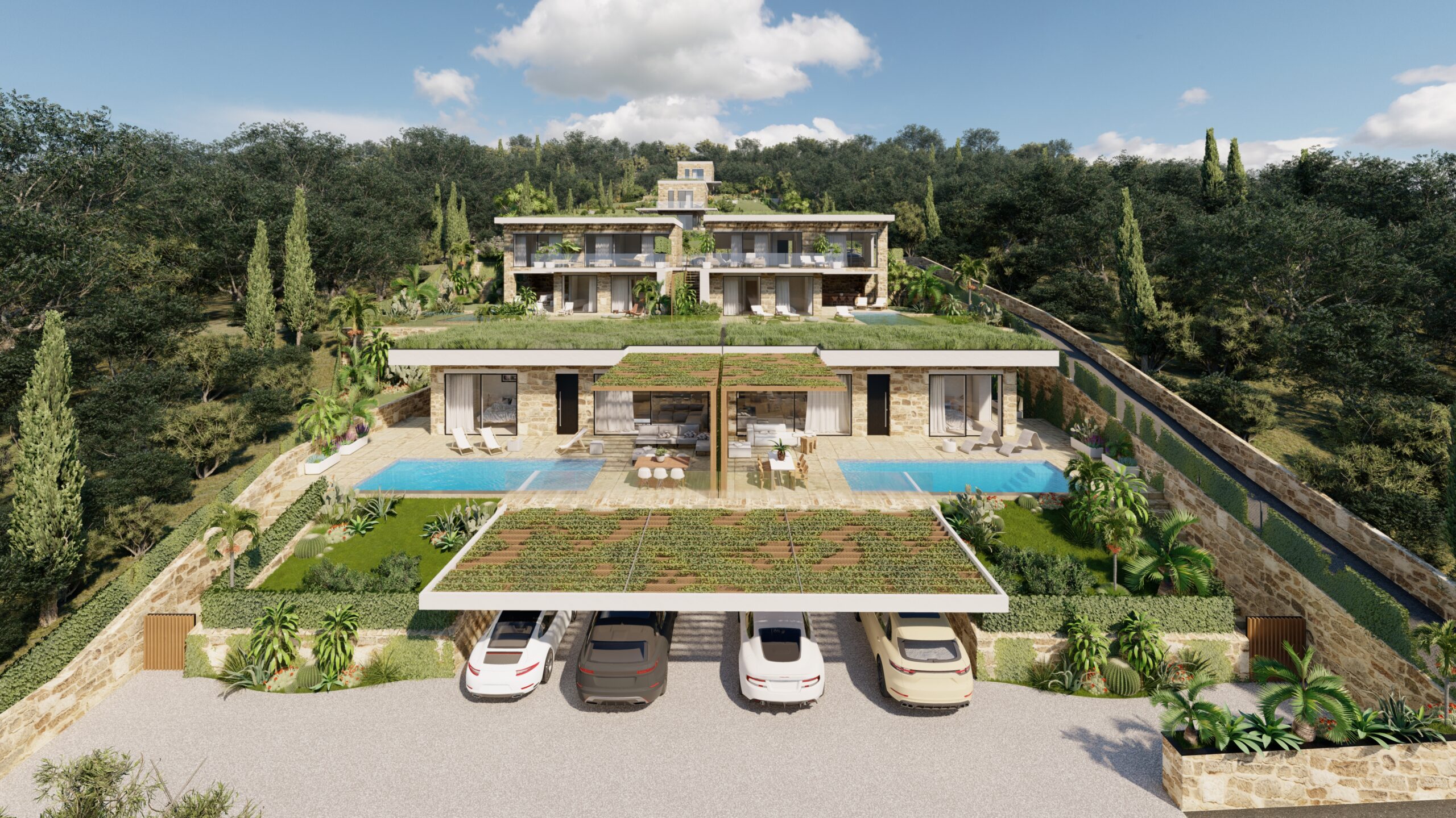 Villa Specifications: Each villa offers a living space ranging from 124 to 184 m², featuring modern designs with natural stone exteriors, panoramic windows, and high-quality finishes (the 7,070 m² plot is shared by all six villas, not equally).