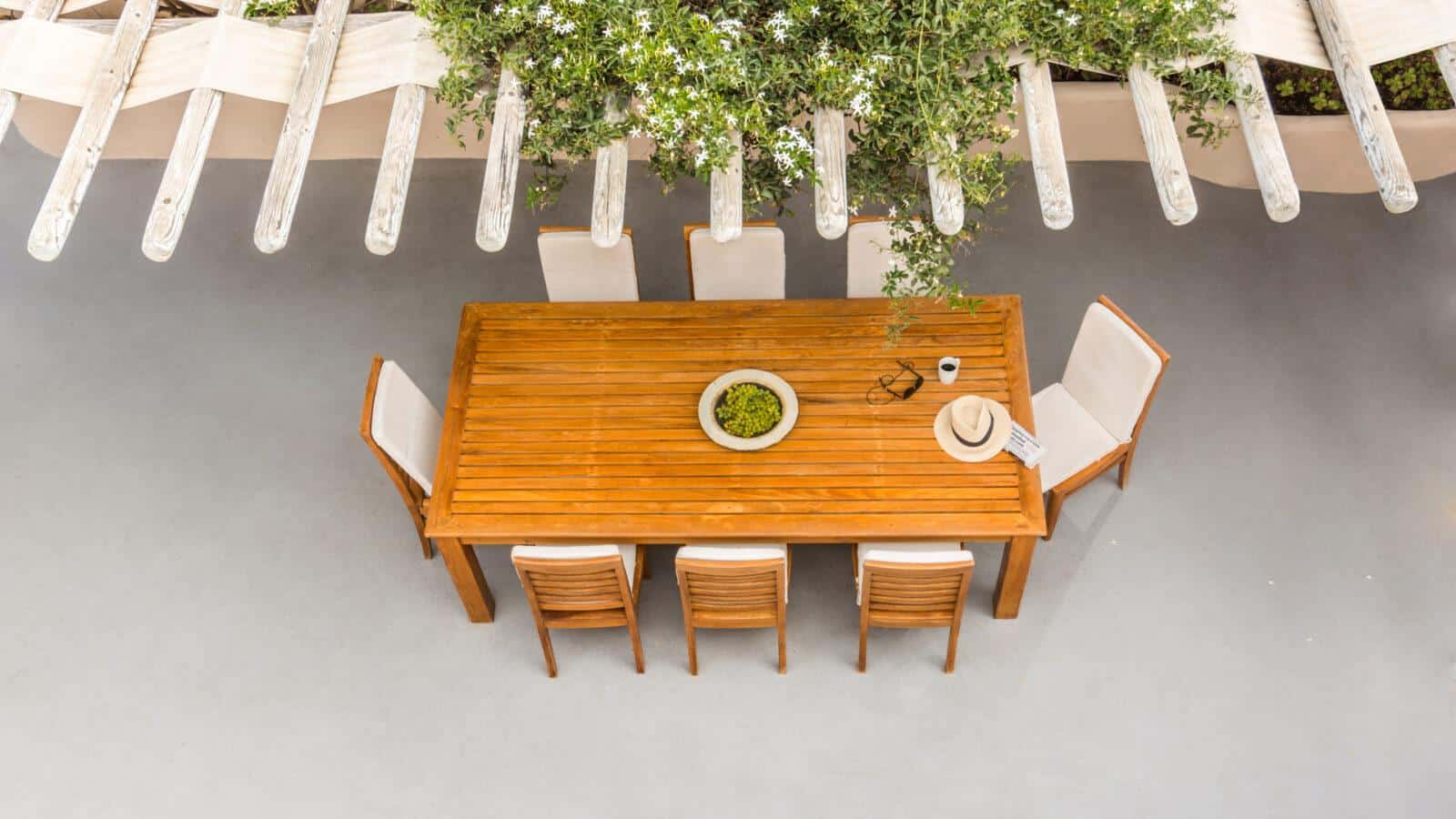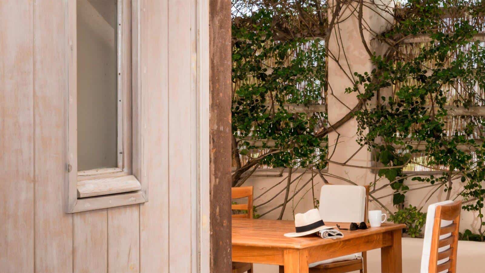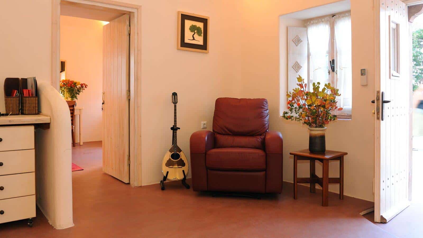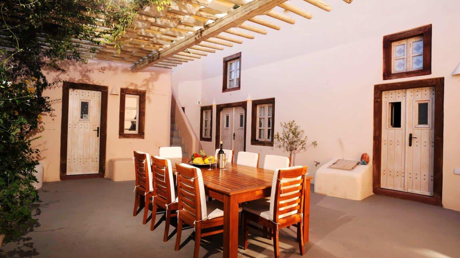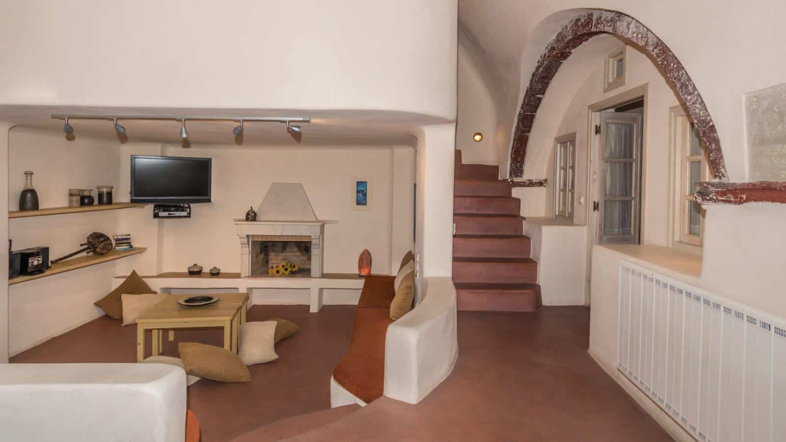 The inviting dining area and living room contribute to a warm and welcoming atmosphere, ideal for gatherings and relaxation. Large windows allow natural light to flood the interiors, offering stunning views of the surrounding beauty. A terrace adds to the allure, providing a serene space to enjoy the breathtaking Santorini sunsets and gentle sea breezes.