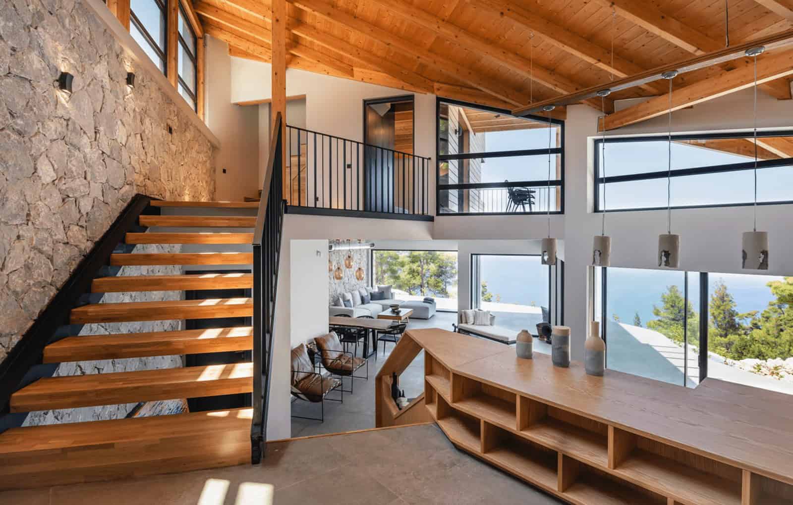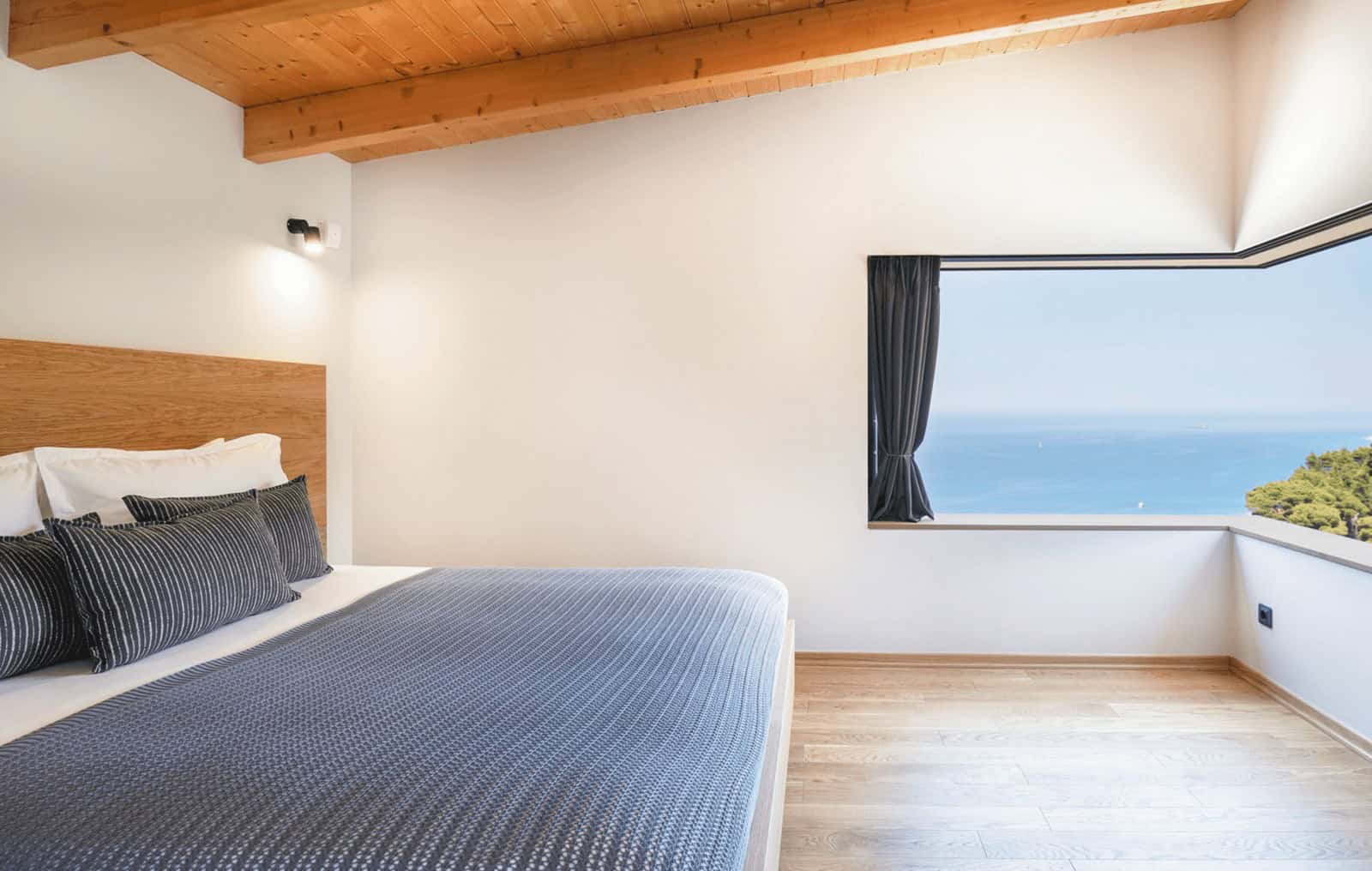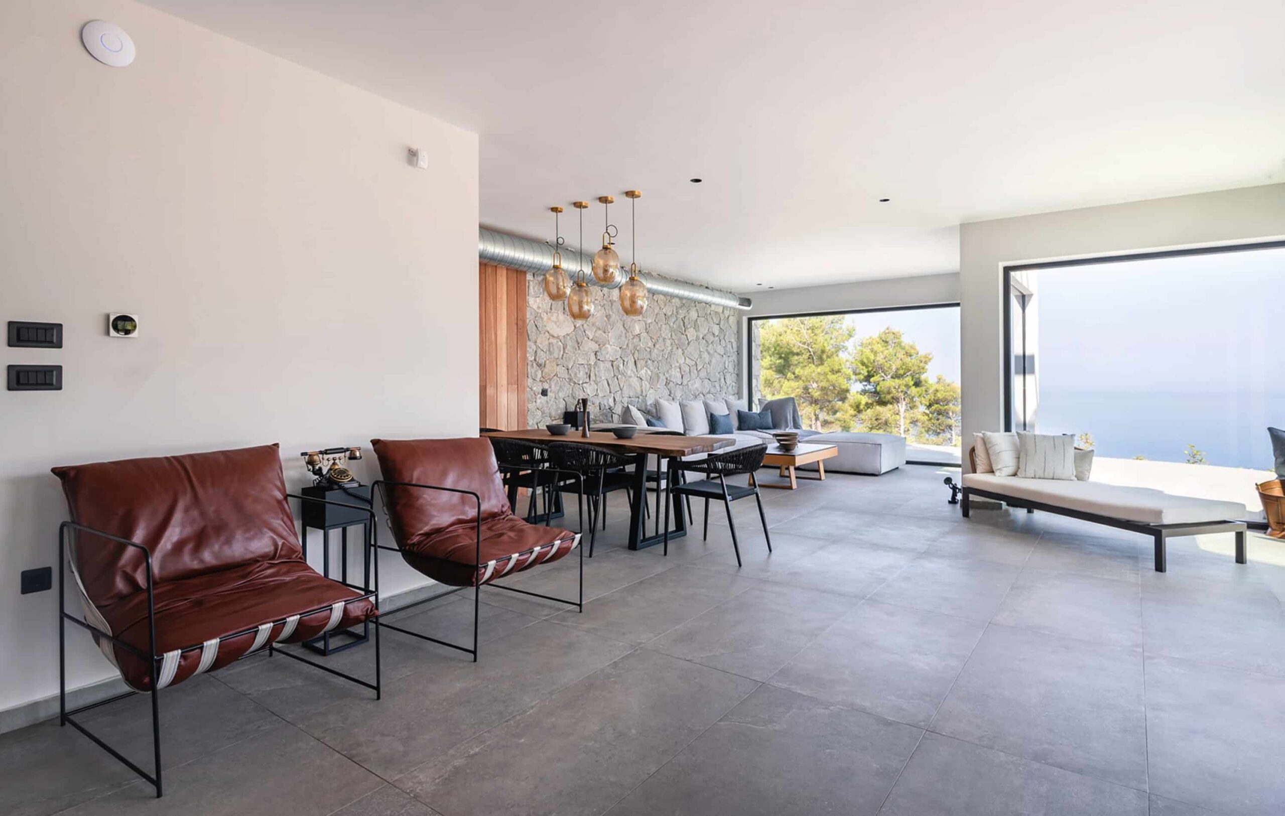 The villa is spread over four floors, with three independent guest rooms in the grounds. The front door opens onto a mezzanine gallery overlooking a fabulously voluminous open-concept communal space on the ground floor. The double-height ceilings of the central atrium create an extraordinarily airy and tranquil atmosphere. The eye-catching geometric design and layout create ever-changing perspectives, while banks of oversized picture windows offer seemingly endless variations on the breathtaking sea views. Alternating white and exposed stone walls add character, while slate-grey flooring and bespoke wooden cabinetry combine elegantly with black metal fixtures and fittings.
