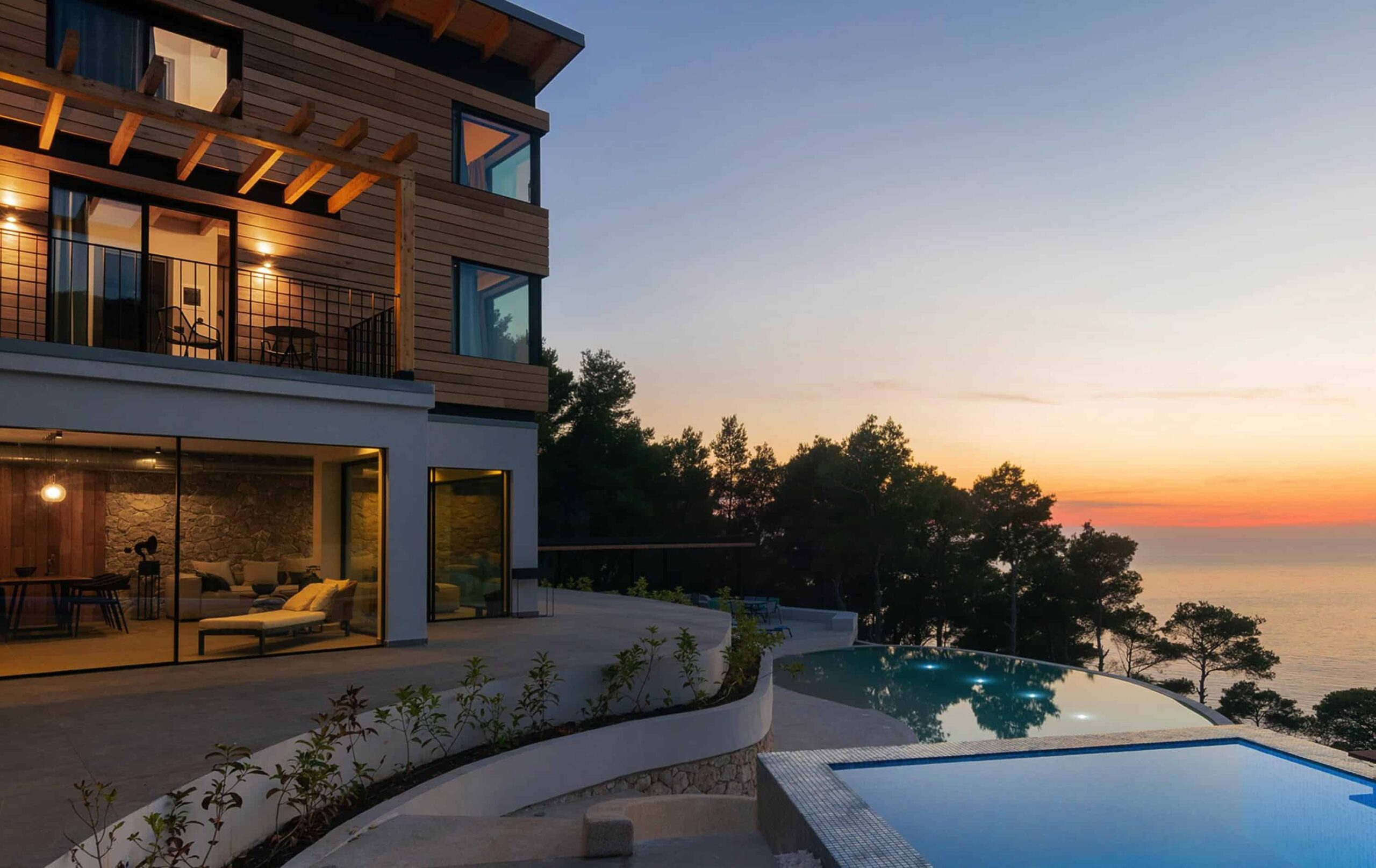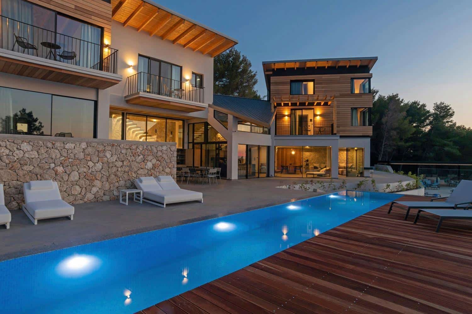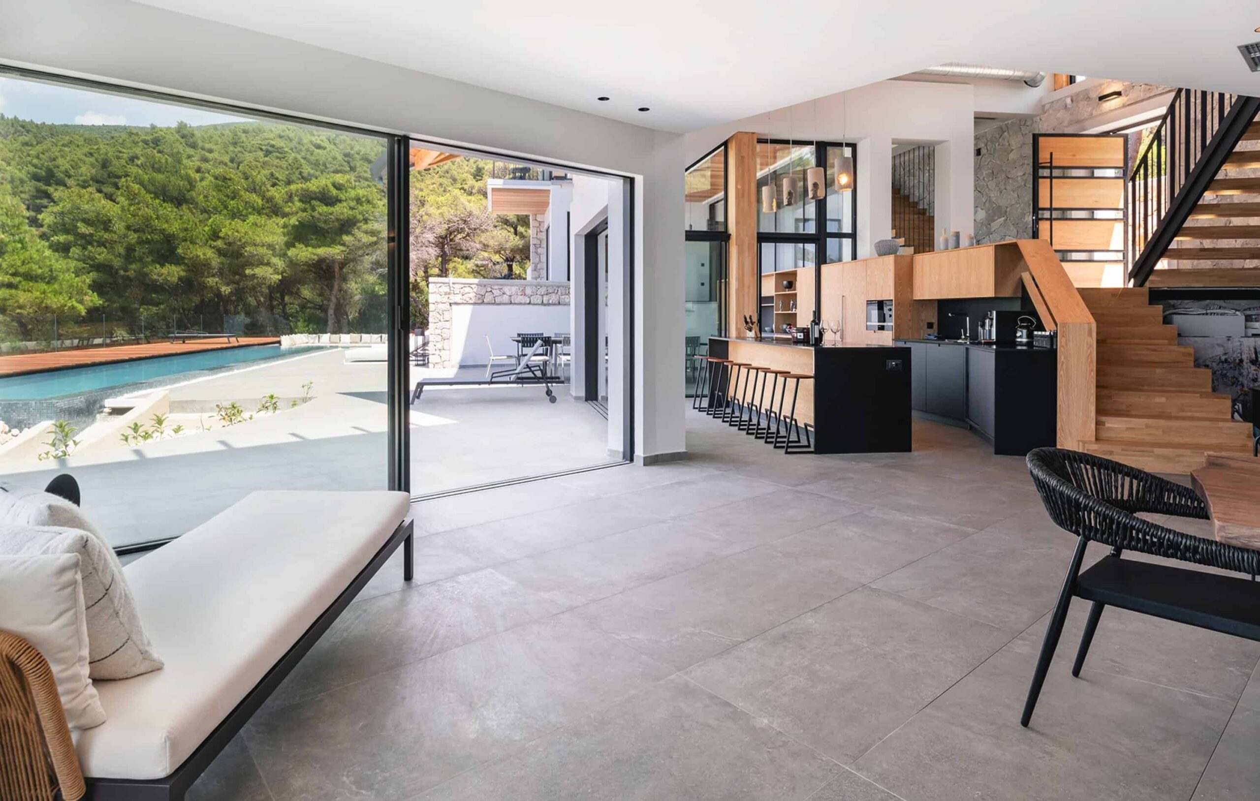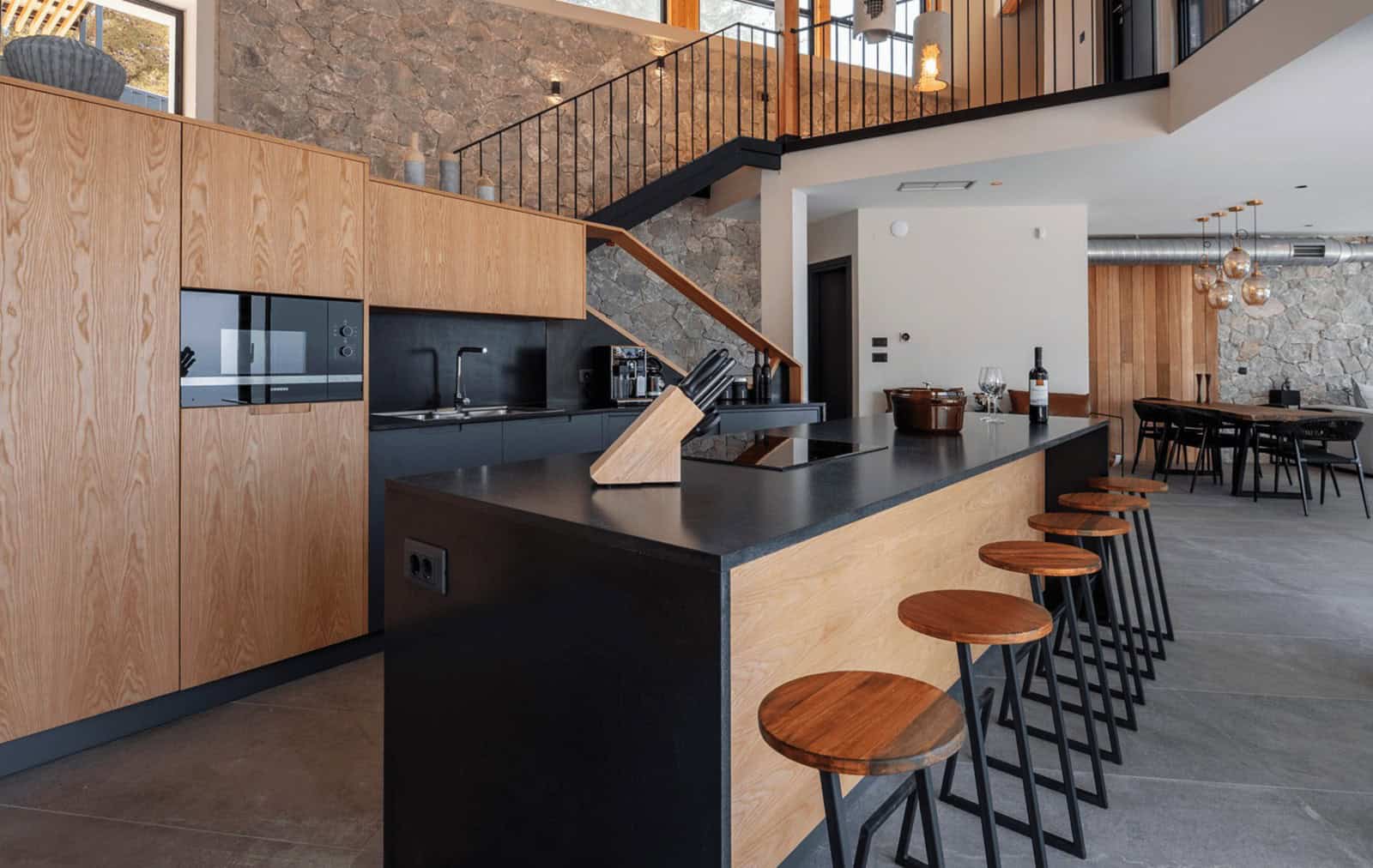 The villa is spread over four floors, with three independent guest rooms in the grounds. The front door opens onto a mezzanine gallery overlooking a fabulously voluminous open-concept communal space on the ground floor. The double-height ceilings of the central atrium create an extraordinarily airy and tranquil atmosphere. The eye-catching geometric design and layout create ever-changing perspectives, while banks of oversized picture windows offer seemingly endless variations on the breathtaking sea views. Alternating white and exposed stone walls add character, while slate-grey flooring and bespoke wooden cabinetry combine elegantly with black metal fixtures and fittings.