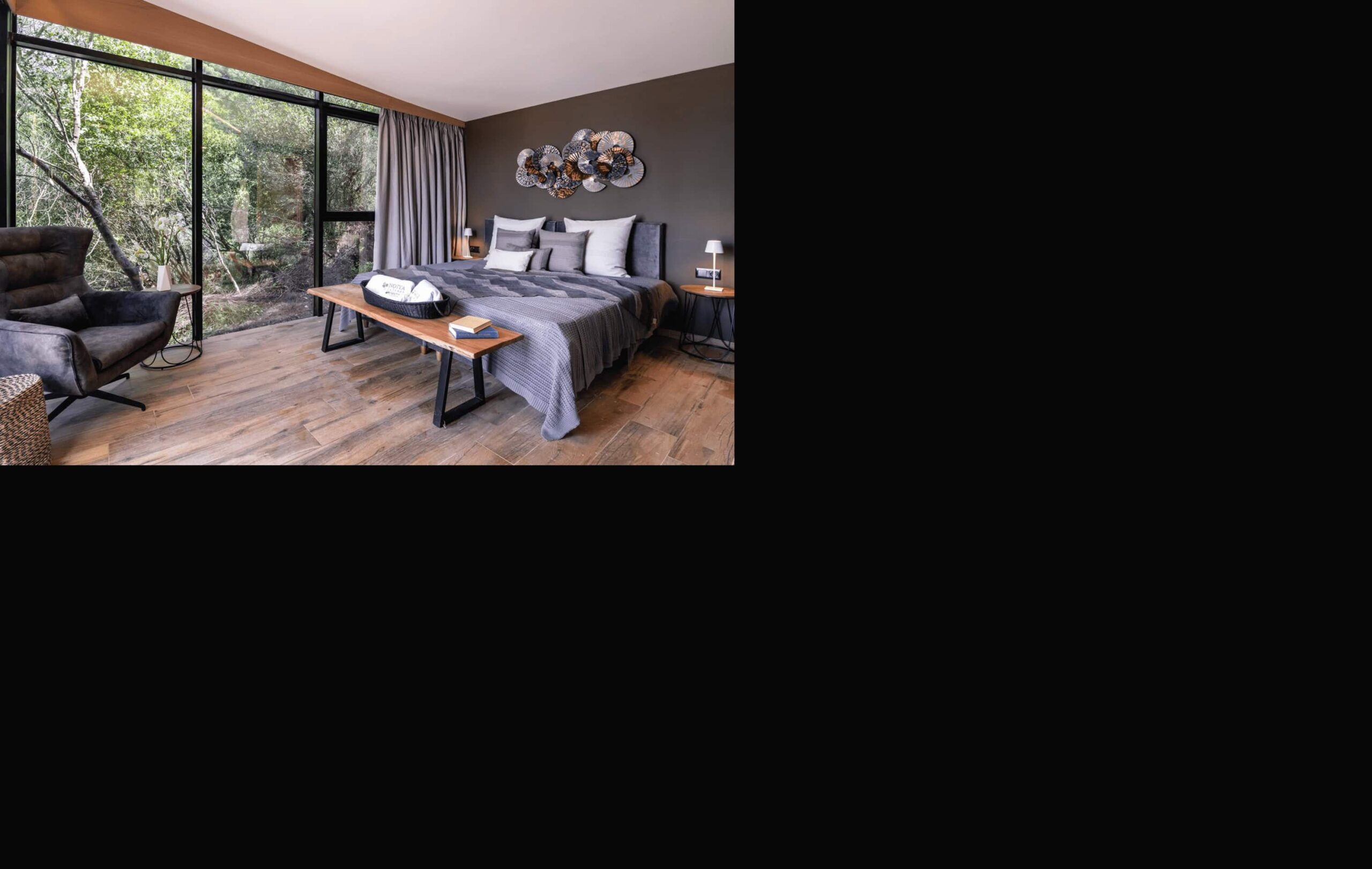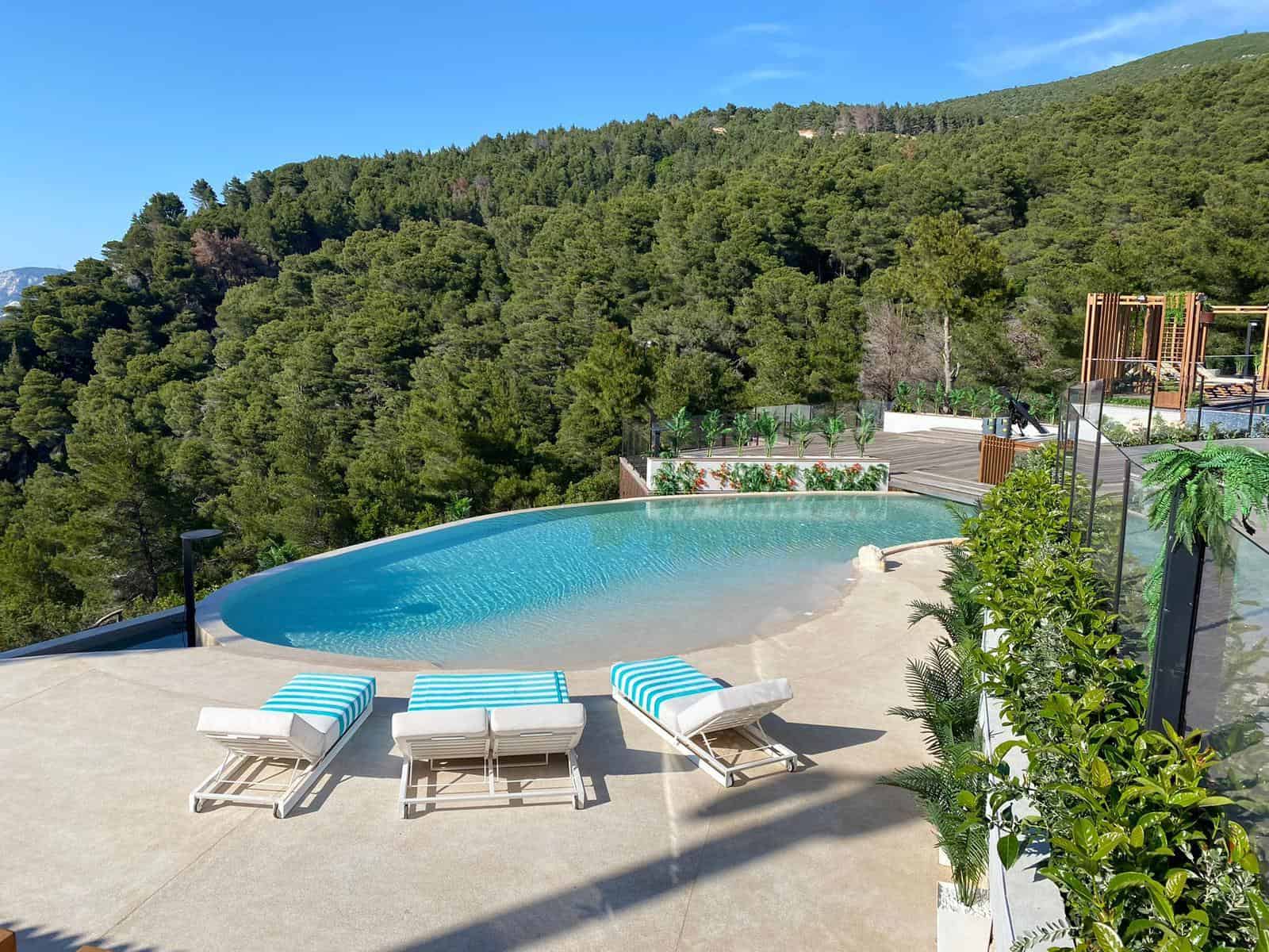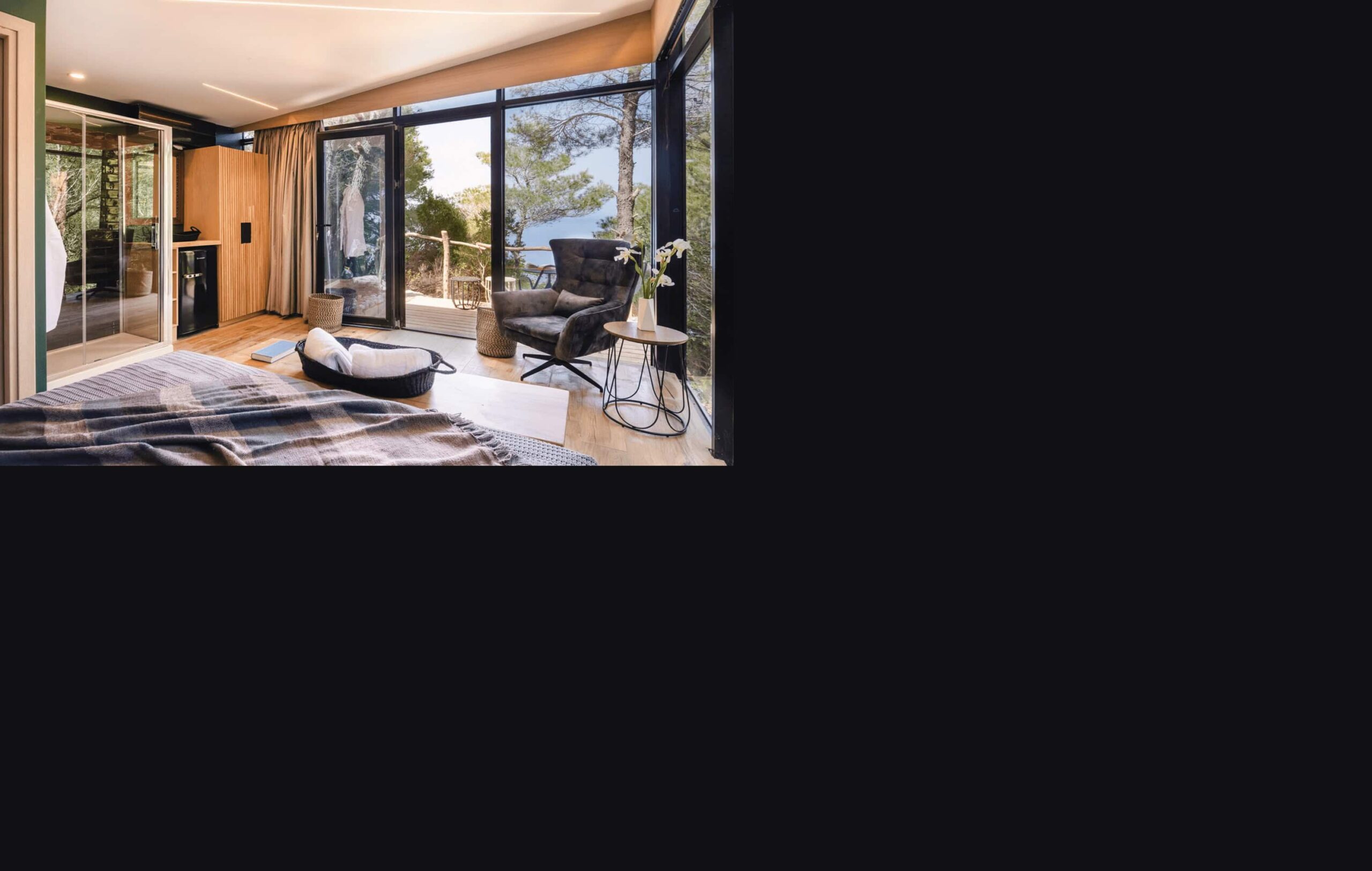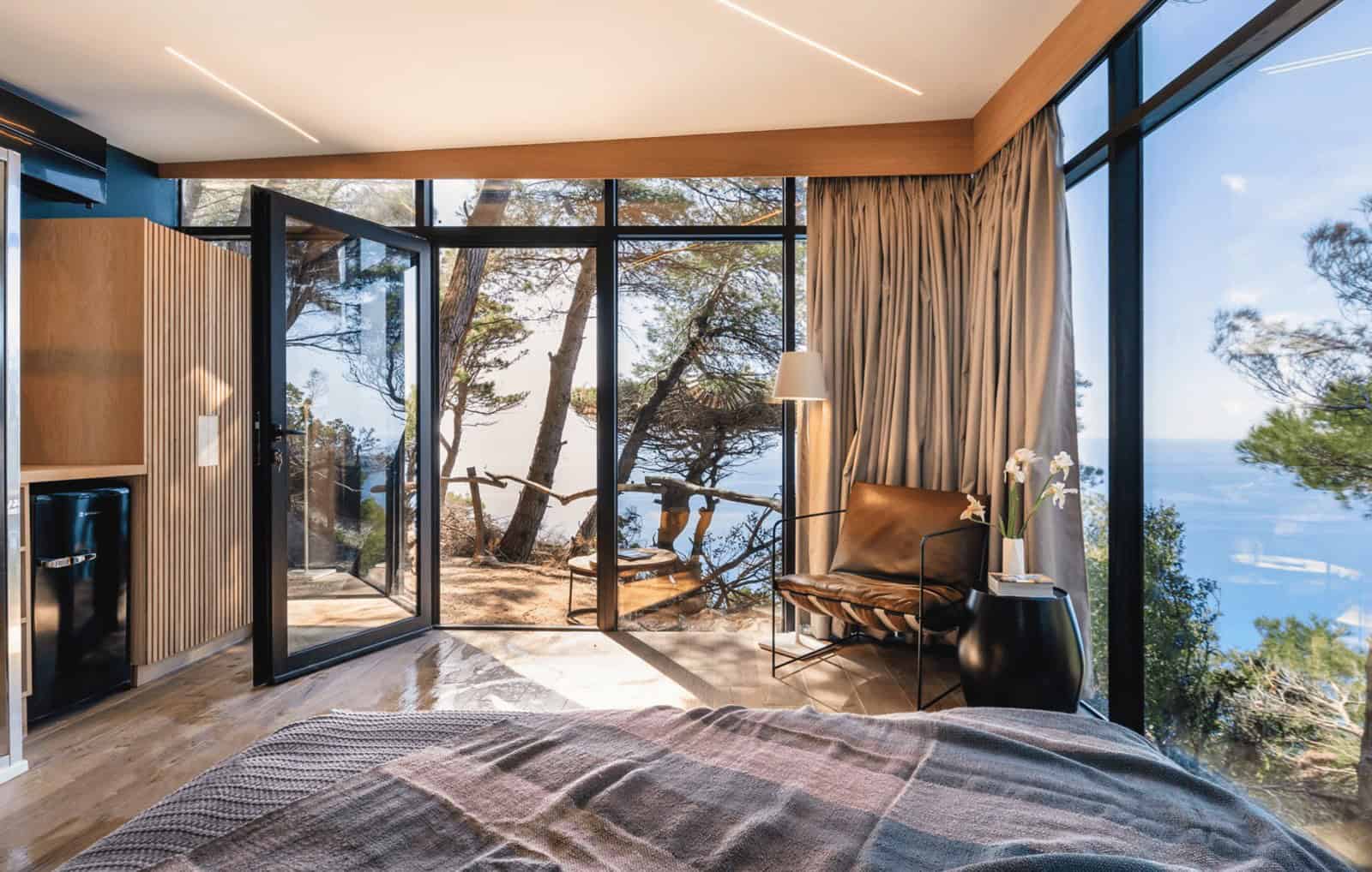 A path leads down below the pool to the three independent guest rooms, hidden away in the fragrant pine woods of the extensive grounds. Camouflaged by the mirrored glass walls reflecting the surrounding trees, they offer a contemporary take on a traditional log cabin, discreetly immersed in their natural habitat but finished and furnished with luxury. One hosts a generous double bedroom, the other two double-twin bedrooms. All three have decked terraces, en-suite shower rooms, and breathtaking views from the greenery to the blue sea below.