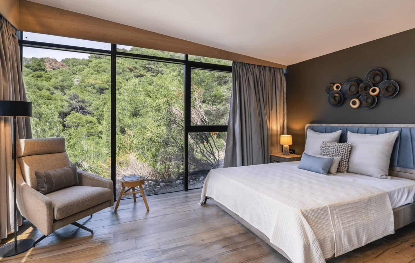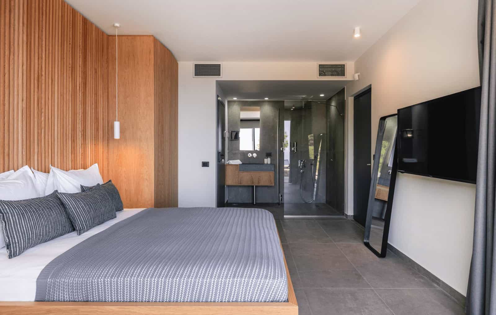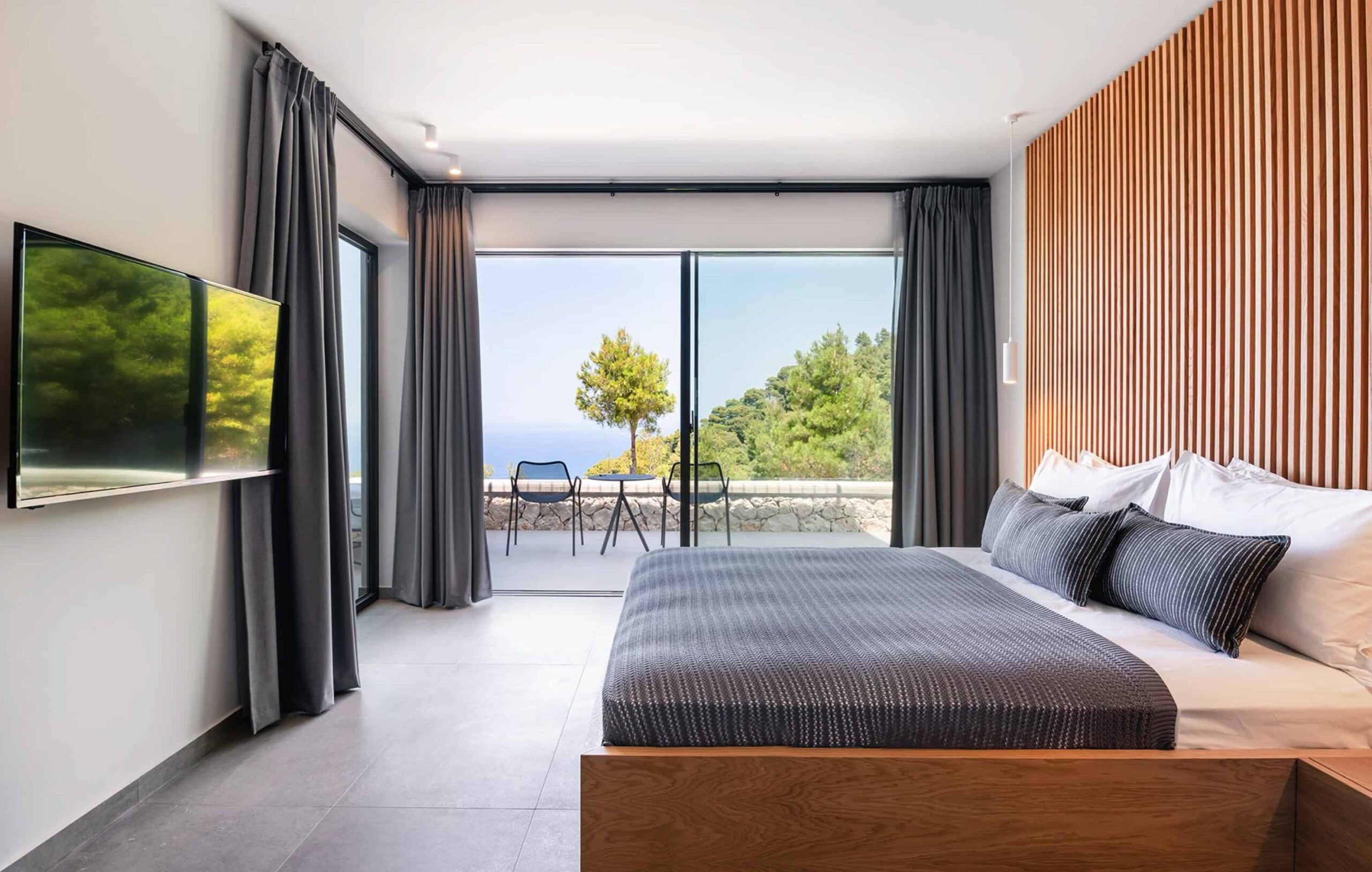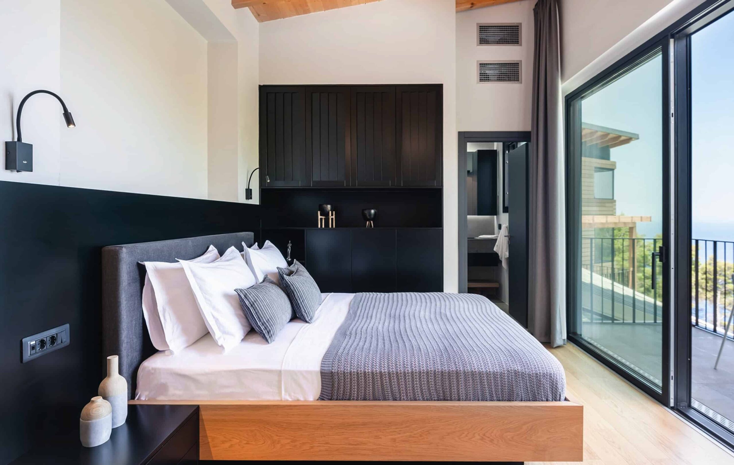 Back on the mezzanine gallery, an open corridor sweeps to the first of eight bedrooms, a sea-view double with an in-room, walk-in shower, a sink, and an en-suite WC. Sliding glass doors open onto a panoramic terrace. Returning once more to the gallery, a pair of staircases lead up to two sleeping wings – east and west – on either side of the house: