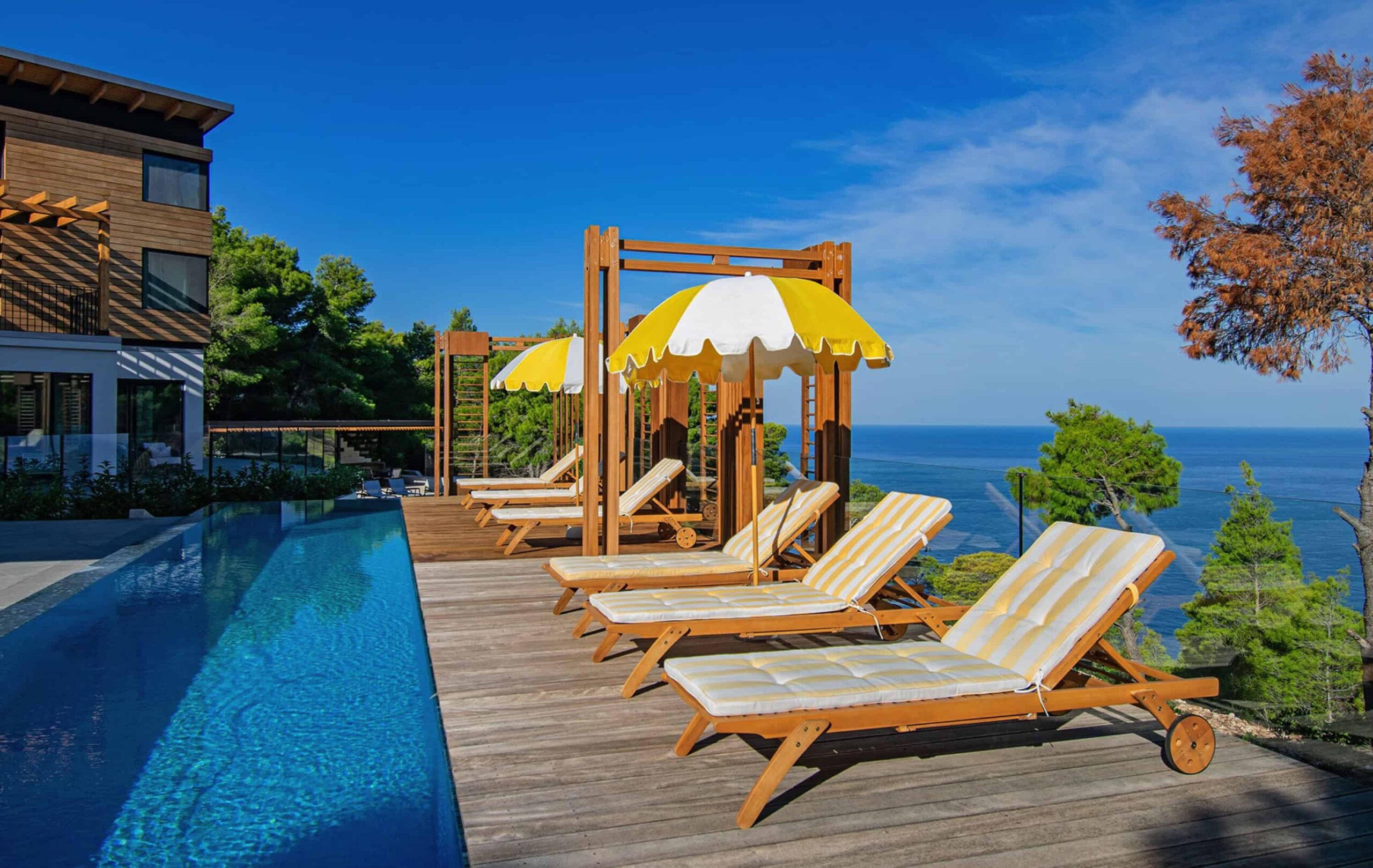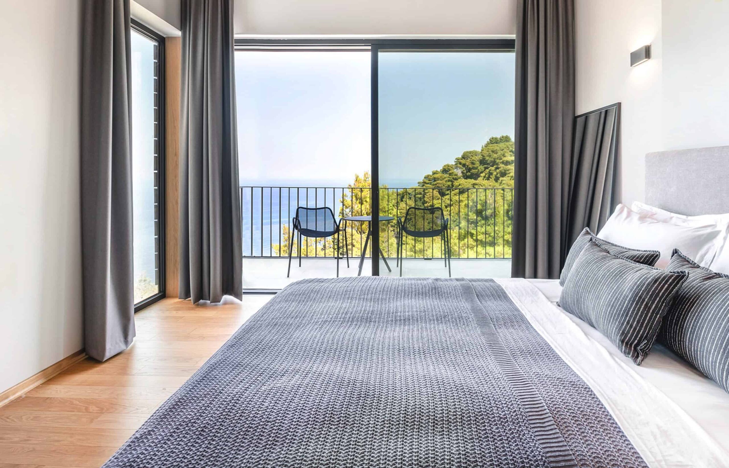 – The east wing houses one double and one double-twin bedroom, both with en-suite shower rooms, incredible sea views, and balconies overlooking the terraces, the gardens, the pools, and the sea.