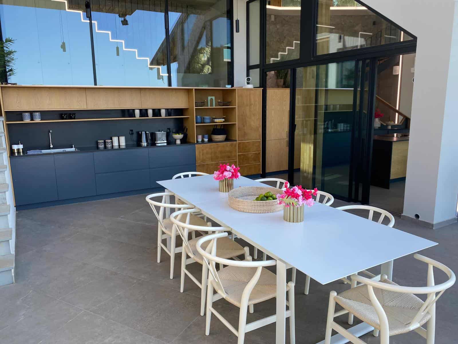 Overlooking the lower pool is another al fresco dining area and a fabulous outdoor kitchen under a shady pergola. Equipped with a pizza oven, a large barbecue, a bar, work surfaces, fridges, an ice machine, and a dishwasher, it is perfect for professional chefs and keen amateurs.