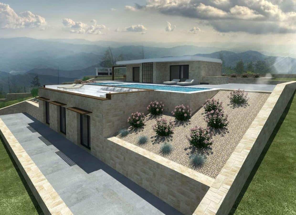 Spanning 233m² on a 3,162m² gradient plot, the villa showcases an ingenious design with two visually distinct buildings connected internally. The upper level encompasses the living room, kitchen, dining area, storage room, and bathroom. In contrast, the lower level hosts three bedrooms and three bathrooms, including a master bedroom with a dressing room. Nestled between the two levels, a pool, sitting area, and outdoor fireplace create an inviting, relaxing space.