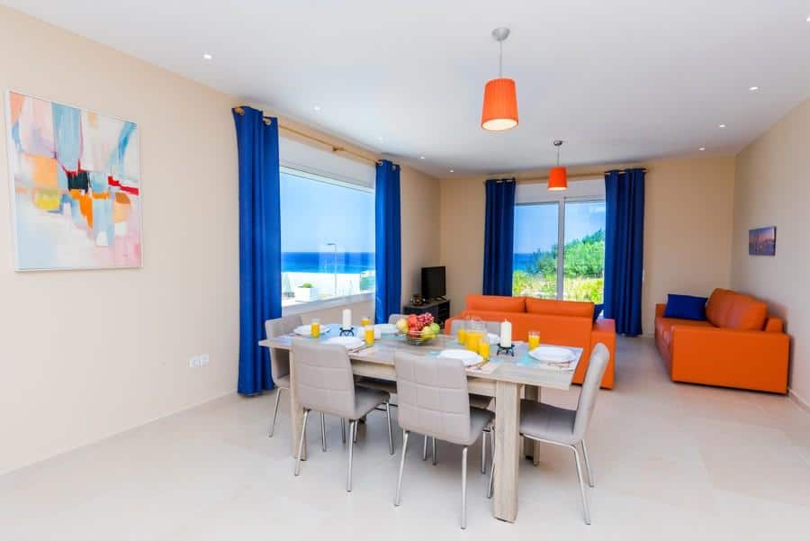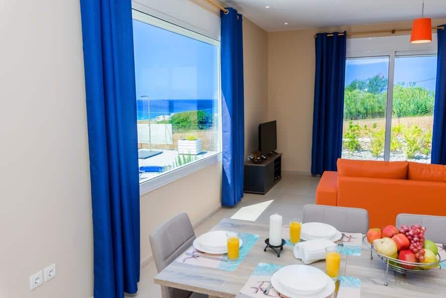 This amazing villa for sale in Apokoronas, Chania is located in the village of Dramia, near Georgioupoli. The house is newly constructed, has a living space of 128m² and features three bedrooms and three bathrooms. The villa is developed on one floor and is fully equipped. It is also air-conditioned throughout, has mosquito nets on the windows, offers access to the garden from all the bedrooms and even includes all the appliances from a washing machine to hair dryers. Two of the bedrooms have double beds and bathrooms with showers, while the third one has twin beds – and the third bathroom has a bathtub.