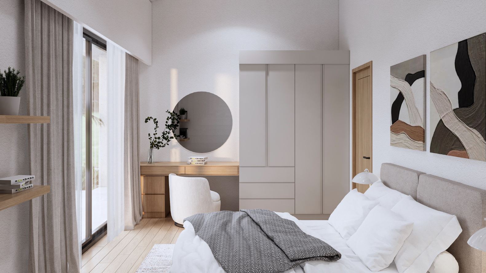 Embracing a minimalist architectural aesthetic, the villa features clean lines, expansive interiors, and a harmonious color palette of soft blues, whites, and azure tones, evoking a sense of peace and sophistication. Illuminated with elegant white lighting and accented with refreshing blue hues, the design exudes contemporary elegance.